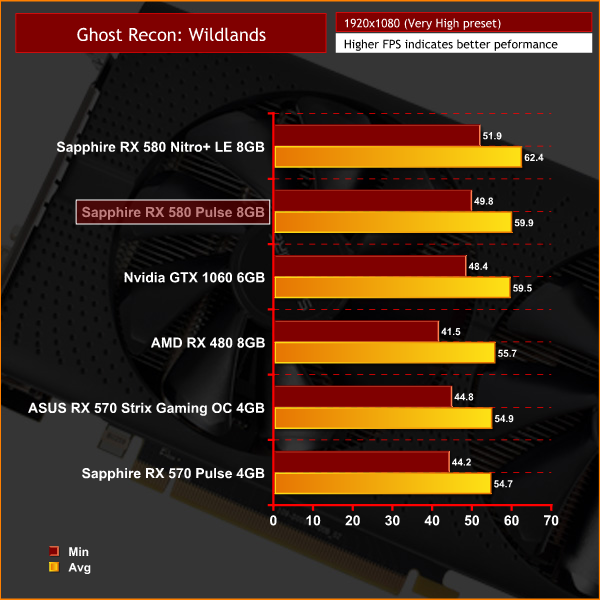 The RX 580 Pulse wins a very tight battle with the GTX 1060 here, being no more than a single frame faster across either resolution.
