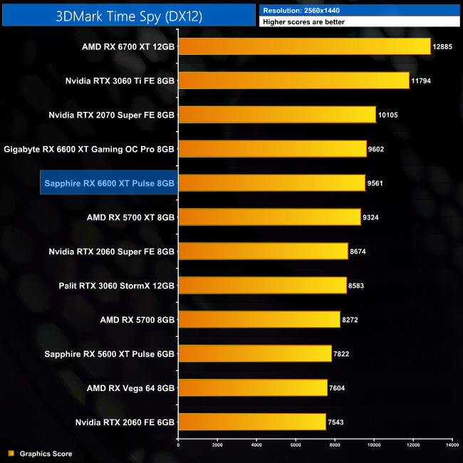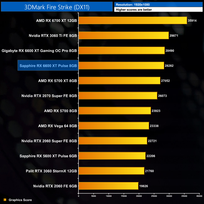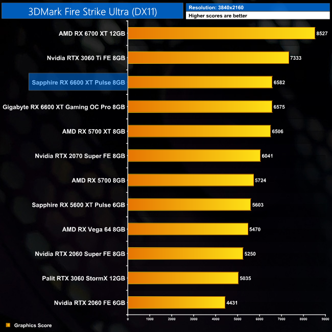 Kicking off with our 3DMark benchmarks, there's really nothing between either the Sapphire Pulse or Gigabyte Gaming OC Pro cards in these benchmarks. The Gaming OC Pro does score fractionally higher in Fire Strike and Time Spy, but we're talking differences of less than 1%. Meanwhile, in Fire Strike Ultra, the Pulse is just 0.1% ahead of the Gaming OC Pro.