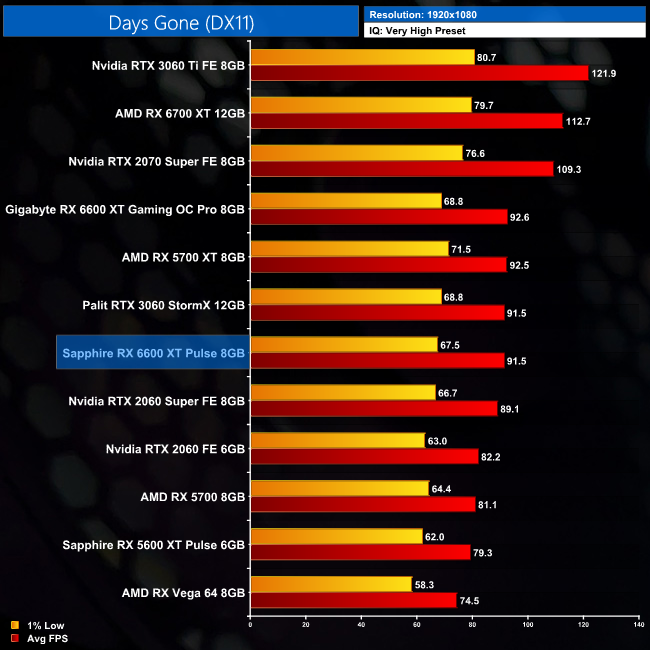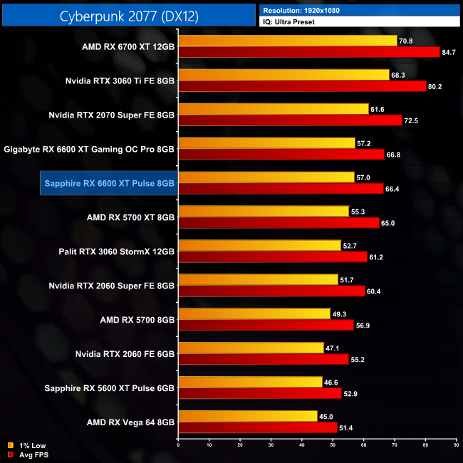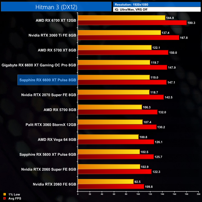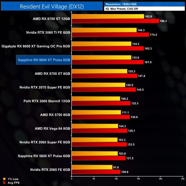 It's not a surprise to see the margins between the Sapphire Pulse and Gigabyte Gaming OC Pro are essentially non-existent in our 1080p game benchmarks. Both are factory overclocked models and are essentially as fast as each other. In fact, the single biggest difference between the two came in Gears 5, and that was a margin of 1.8%. In Cyberpunk 2077, Hitman 3 and Resident Evil Village, the average frame rates fell within 1% of each other.