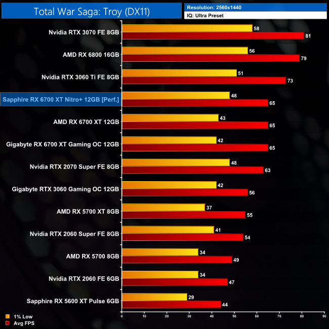Total War Saga: Troy is exactly the same as Red Dead Redemption 2, as we see no difference in frame rates between the Nitro+ and AMD's reference card, at either resolution tested.