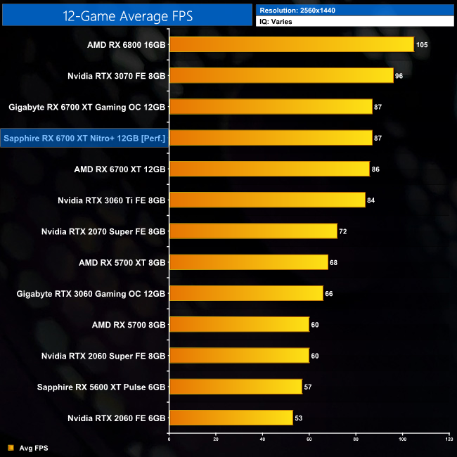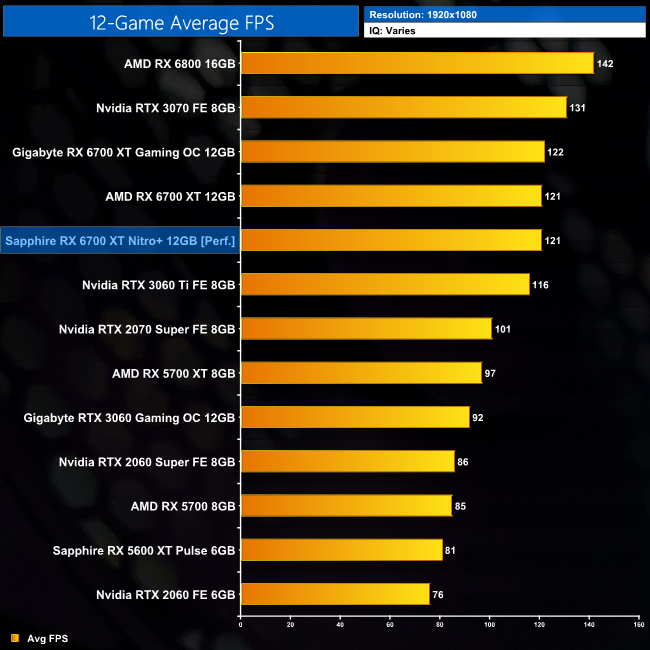 Averaged across the 12 games we tested, the Nitro+ is no faster than the reference card at 1080p, as both deliver 121FPS. At 1440p, the Nitro+ is fractionally faster, on average by just 1%.