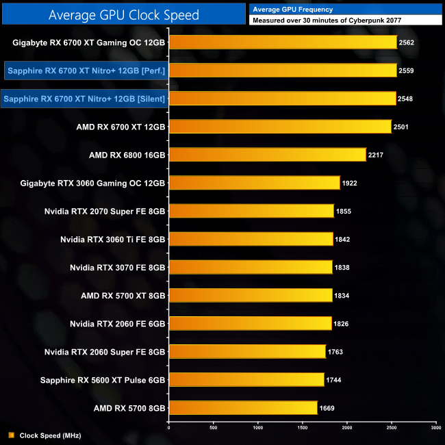 Here we present the average clock speed for each graphics card while running Cyberpunk 2077 for 30 minutes. We use GPU-Z to record the GPU core frequency during gameplay. We calculate the average core frequency during the 30 minute run to present here.