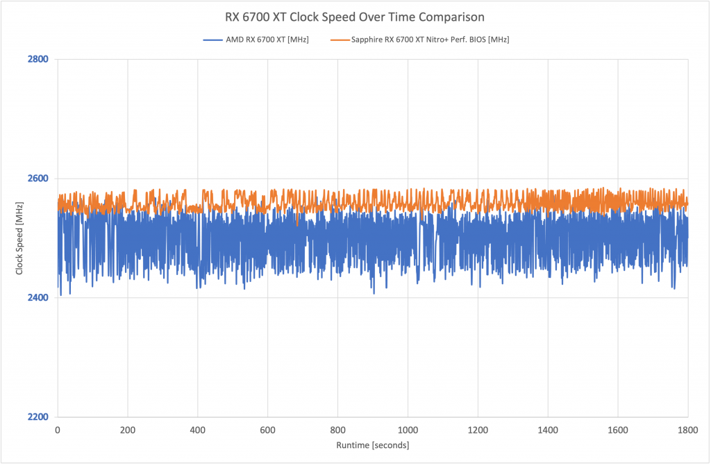 As for the clock speed behaviour of the Nitro+, both BIOS run effectively as fast as each over, with just an 11MHz difference when averaged over our thirty minute stress test. Compared to the reference card, the Nitro+ is about 50MHz faster, and while this is certainly not a big difference, we can see from the scatter graph above that the clock frequency is more stable with the Nitro+, with a much tighter plot compared to the reference card.
