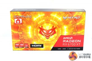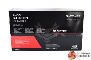 The Sapphire RX 6700 XT Nitro+ ships in a very eye-catching box, with mostly yellow and orange used on the front. There's no photo of the card itself, just the branding and the Nitro logo in the middle. On the back, Sapphire highlights some key specs and features of the GPU.