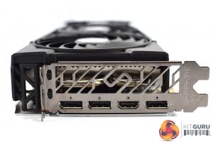 Power requirements and display outputs are the same as reference – meaning the card needs 1x 8-pin and 1x 6-pin power connectors, and it offers 3x DisplayPort 1.4 and 1x HDMI 2.1 video outputs.