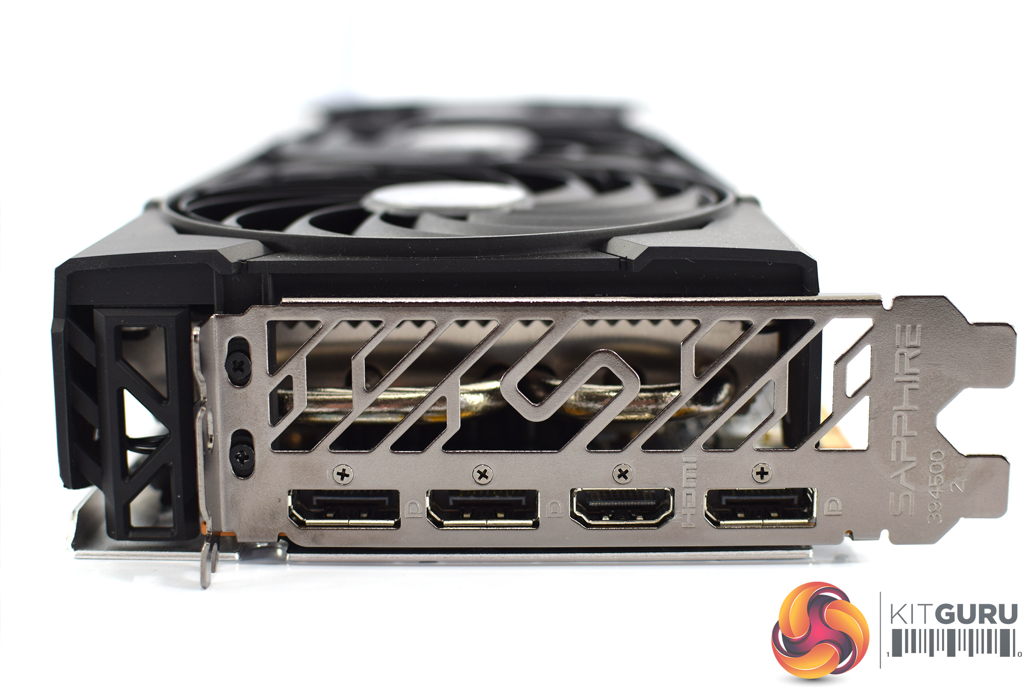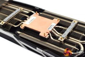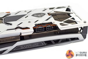 The cooler is using three fans, with the central fan measuring 90mm while the outer two measure 100mm. All three feature a ring around the outer edge of the fan, and Sapphire calls the new design a ‘Hybrid Fan’, as they say it is meant to offer the increased pressure of a blower fan combined with the traditional low noise levels of an axial fan. We can also see the central fan spins in reverse, relative to the outer two, similar to what we’ve seen from the likes of Gigabyte and ASUS over the past year or two.