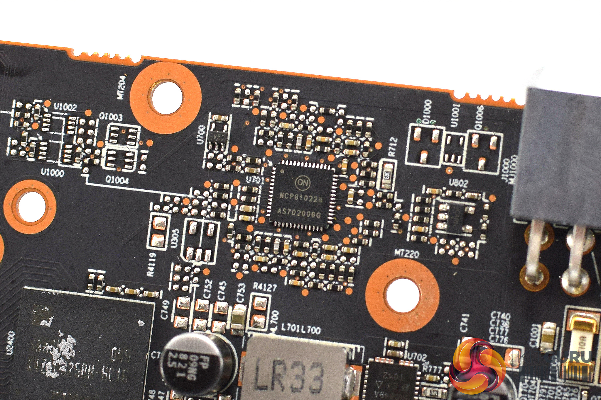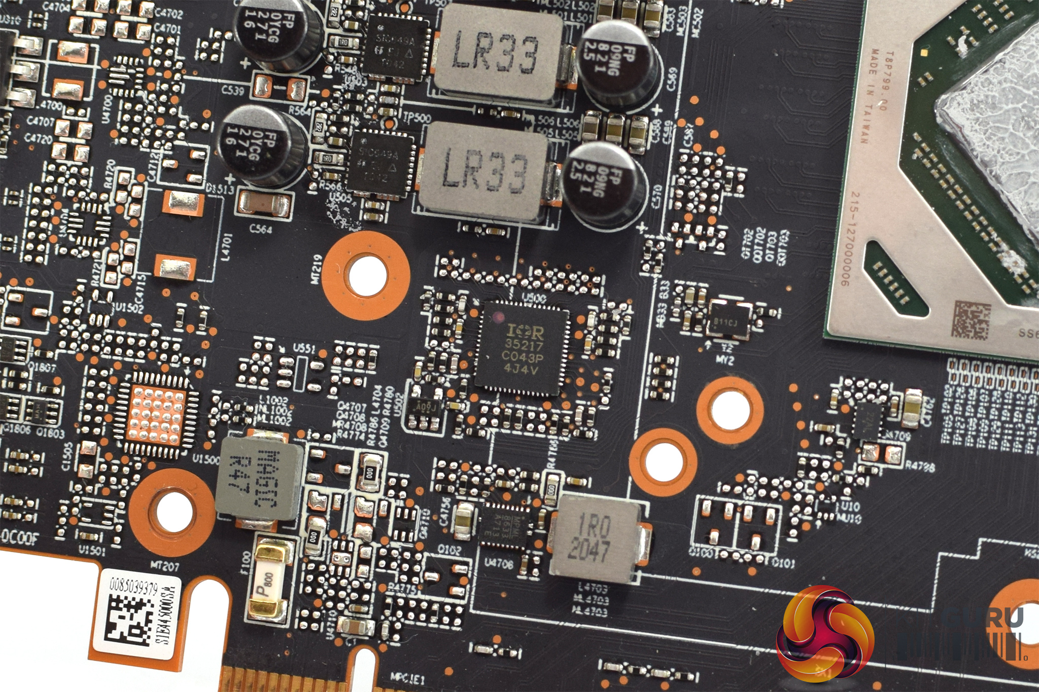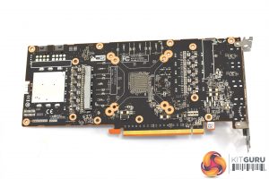 Removing the heatsink gives us a good look at the PCB, with Sapphire's design appearing very close to the reference board. It uses 11 power phases, split with 9 for the GPU and 2 for the memory. The GPU VRM is controlled by International Rectifier's IR35217, while the memory controller used is OnSemi's NCP81022N. Vishay SIC632A and SIC649A MOSFETs are used throughout.