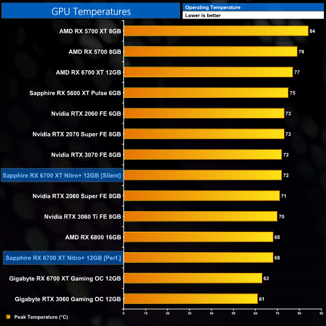 For our temperature testing, we measure the peak GPU core temperature under load. A reading under load comes from running Cyberpunk 2077 for 30 minutes.
