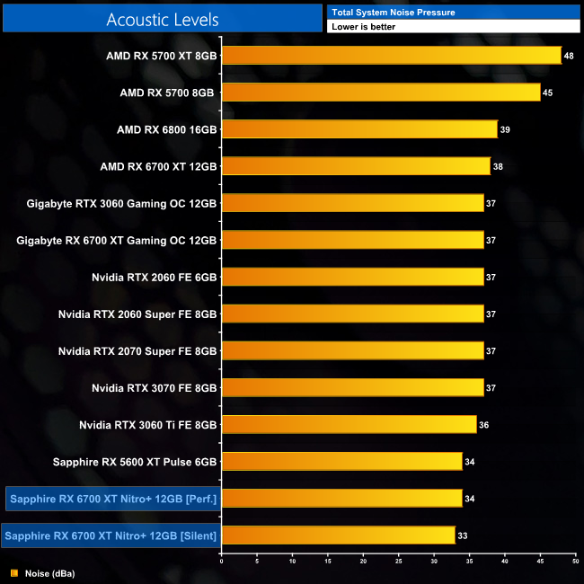 The thermal results only tell half the story however. The fact is, despite running a fair bit cooler, the Nitro+ is also significantly quieter, to the point where it is practically inaudible. There isn't a big difference between the Silent BIOS, which saw the fans spin at 950rpm, versus the Performance BIOS which had the fans at 1040rpm, but either way, this is one of the quietest graphics cards I have ever tested.