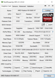 Speaking of power, the reference RX 6800 XT has a rated total board power (TBP) of 300W, though Sapphire has increased this for the Nitro+, as we will see later in this review.