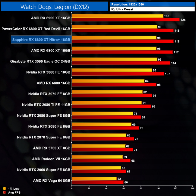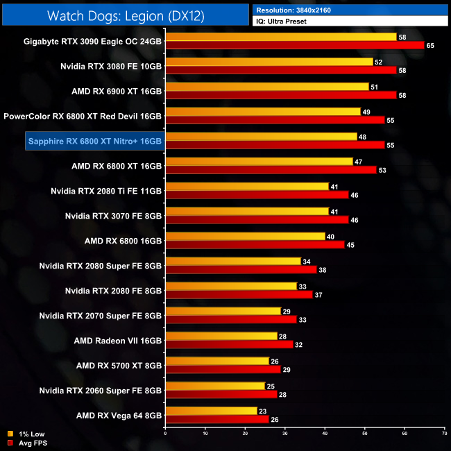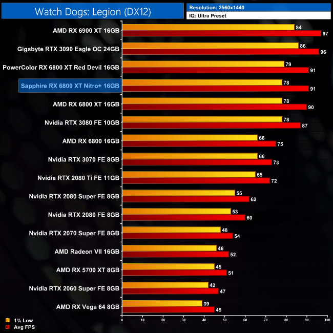 Our final game is Watch Dogs: Legion, where the Nitro+ is 1% faster than the reference card at 1440p. This does rise to 4% at 4K, however, putting it level with the Red Devil but just 5% behind the RX 6900 XT.