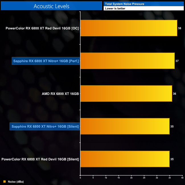 In terms of default fan behaviour, the Performance BIOS saw the fans spin up to 44%, or about 1500rpm, producing 37dBa on our sound meter. This is fractionally quieter than the Red Devil’s OC BIOS, but I’m not sure the human ear would actually be able to notice the difference. As for the Silent BIOS, this dropped fan speed to 35%, or 1200rpm, producing whisper quiet noise levels. In actual fact, just as we found with the Red Devil, with the fans spinning this slowly, a slight amount of coil whine is actually producing more noise than the fans themselves, but I didn’t notice this once the rest of the system fans were spinning at normal speeds.