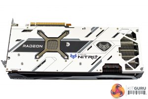 In terms of the backplate, this is a full length aluminium design with a pretty striking silver colour, and I have to say I do really like the aesthetic. There’s a cut-out behind the GPU die, and also at the very end of the card to provide a bit of flow-through from the fan. We can also note the Nitro logo is one of the RGB zones on the card. The rest of the RGB comes from a strip running along the front edge, as well a small Sapphire logo on the front as well. There’s even an ARGB header at the end card to synchronise the lighting with your motherboard.
