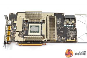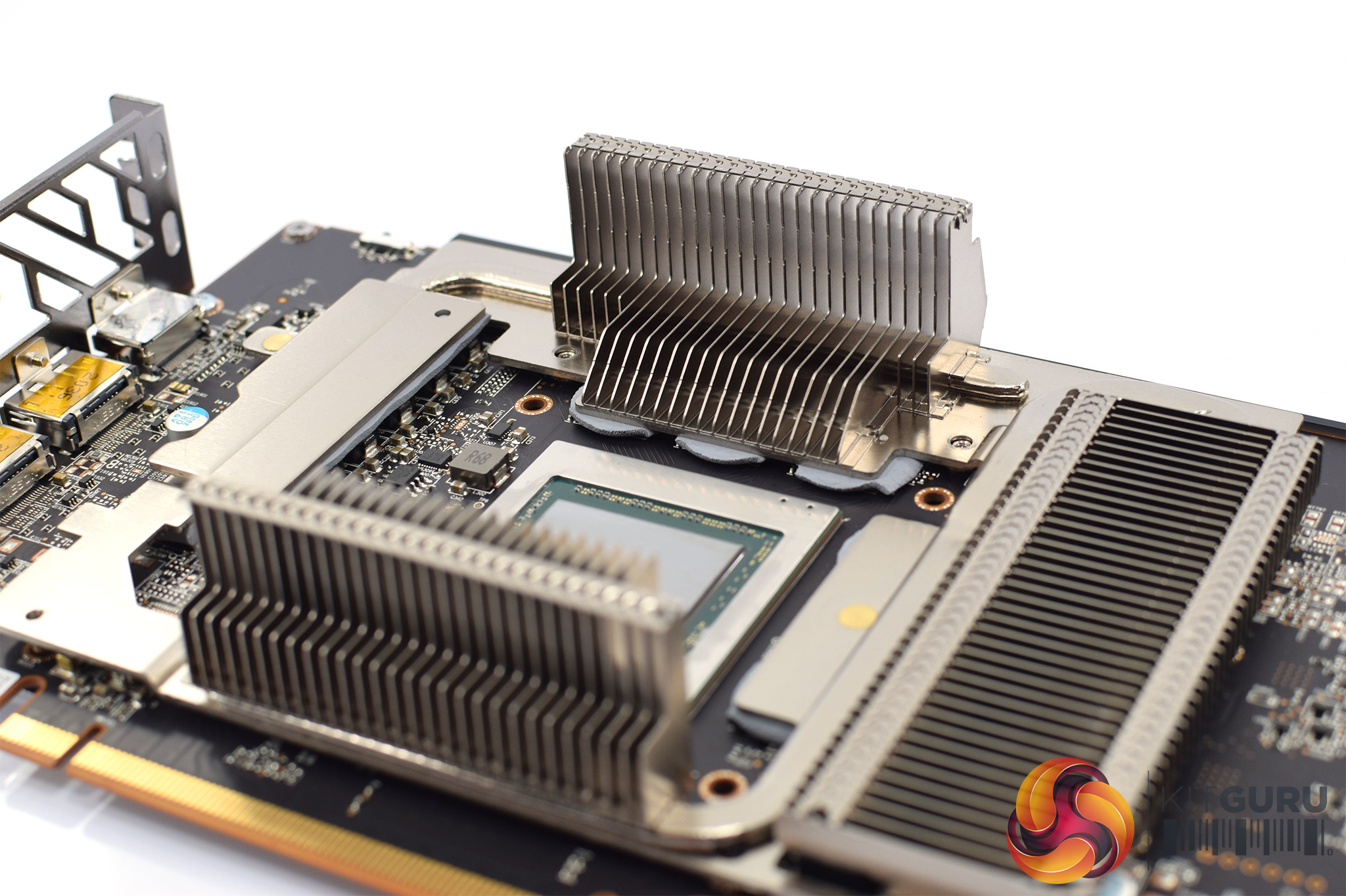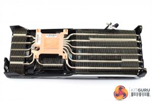Dissembling the card, the first thing to touch on is the use of a dedicated heatsink for the memory and VRM. This uses a couple of flattened heatpipes and three small fin stacks, contacting with the memory and VRM via thermal pads. The primary heatsink also sports three, much larger fin stacks, connected by 6x 6mm heatpipes. Meanwhile, the GPU die contacts with a copper baseplate.