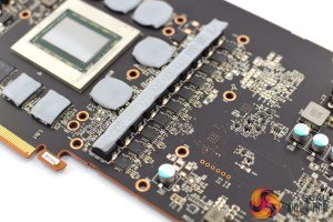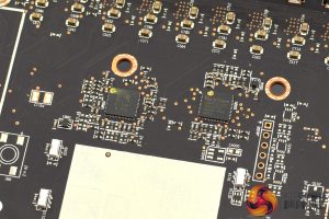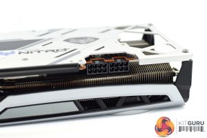 On the front edge of the card, we get a look at the dual BIOS switch. By default, the Nitro+ uses the Performance BIOS (number 1), but you can switch it over to the Silent BIOS (number 2) as well, which drops fan speed, clocks and the power target. There’s even a third position on the BIOS switch, but this is to let you change between Performance and Silent modes using the Trixx software.