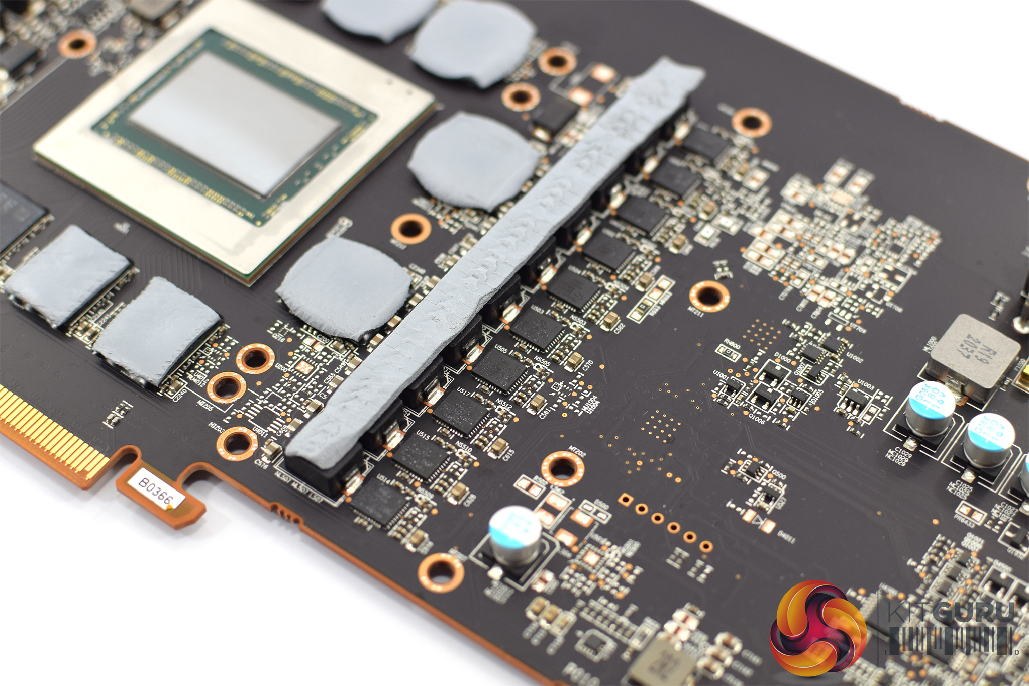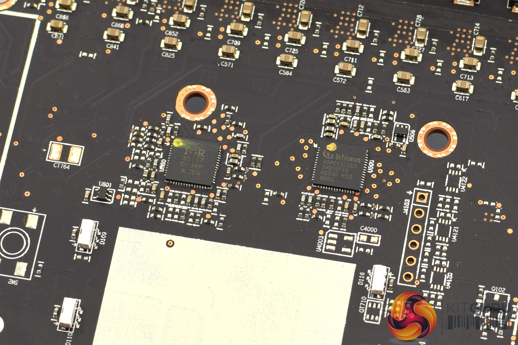 As for the PCB, this looks pretty similar to AMD's reference design, with a 13-phase VRM for the GPU and 3-phase VRM for the memory. Sapphire is using International Rectifier TDA21472 MOSFETs, rated at 70 Amps, while the GPU VRM controller is the Infineon XDPE132G5D. The memory controller is an International Rectifier IR35217, while we can also note the memory modules themselves are from Samsung, rated for 16Gbps.