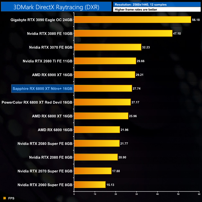 Looking at 3DMark's DXR feature test, the Nitro+ delivers an extra 7% over the reference design, putting it just 5% behind the RX 6900 XT.