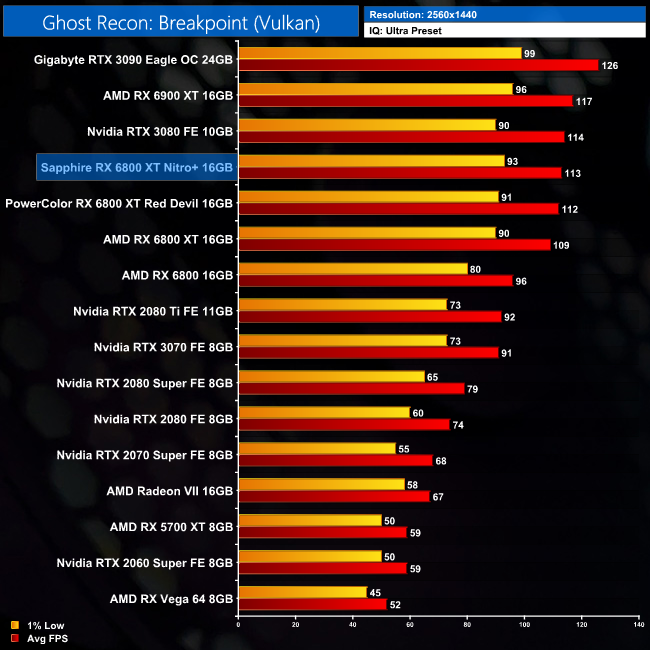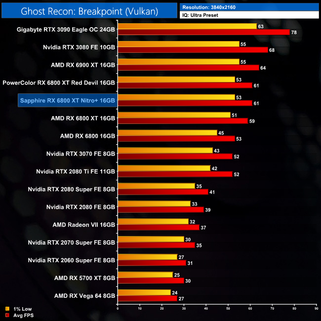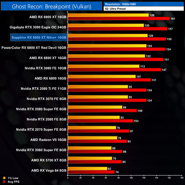 Ghost Recon: Breakpoint shows more limited gains over the reference card, as the Nitro+ is 3% faster at 4K. That puts it on level pegging with the Red Devil in this title, with no more than 1FPS separating the two cards.