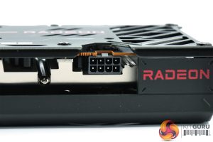 As expected, power is supplied by a single 8-pin connector. We can also note the display outputs, with a single HDMI 2.1 and then three DisplayPort 1.4 connectors. It's important to note these are DP 1.4, not the DisplayPort 2.1 connectors as found on AMD's reference card. This has clearly been done to save cost, and I can't say I mind that much as DP 1.4 is still able to provide enough bandwidth for 1080p 360Hz, even 1080p 480Hz with DSC, and you're unlikely to need more with this level of hardware.