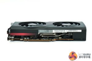 Moving on, in terms of its dimensions, the Pulse comes in at 240 x 107.1 x 44.07mm, so it's fairly short as modern cards go, and only just thicker than two PCIe slots. It is a touch longer than AMD's reference card however, while the Pulse also weighed in at 619g on our scales, making it 130g lighter than the AMD reference design.