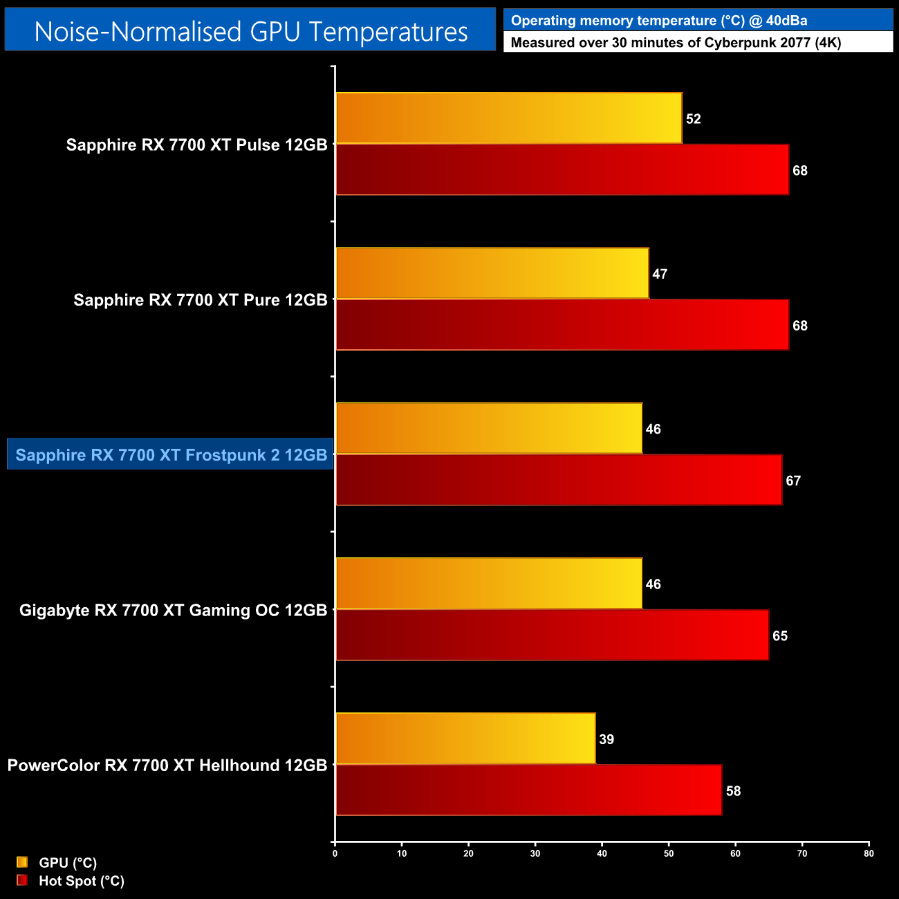 Once we normalised noise output to 40dBa, thermal performance of the Frostpunk 2 was again basically identically to the Pure model – it did clock in 1C lower, but that's basically margin for error and is not of any significance. Compared to other 7700 XT models we've tested, the PowerColor Hellhound is comfortably the best in this department, but the Gigabyte Gaming OC is also very similar to the Sapphire Frostpunk card.