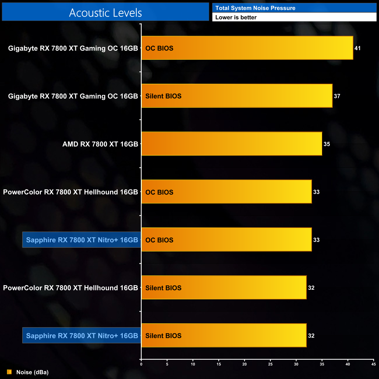 Noise levels are a real success story for the Nitro+. Even using the OC BIOS, we saw fan speed hit just 25%/1150rpm, barely registering at 33dBa on my sound meter. Switching to the Silent BIOS drops this further, to just 17%/810rpm, which is absurdly slow, and at that point we actually hit our ambient noise floor of 32dBa. In other words, the card ran so quietly it became impossible to accurately measure its noise levels in my test environment. There was also no audible coil whine throughout my testing.