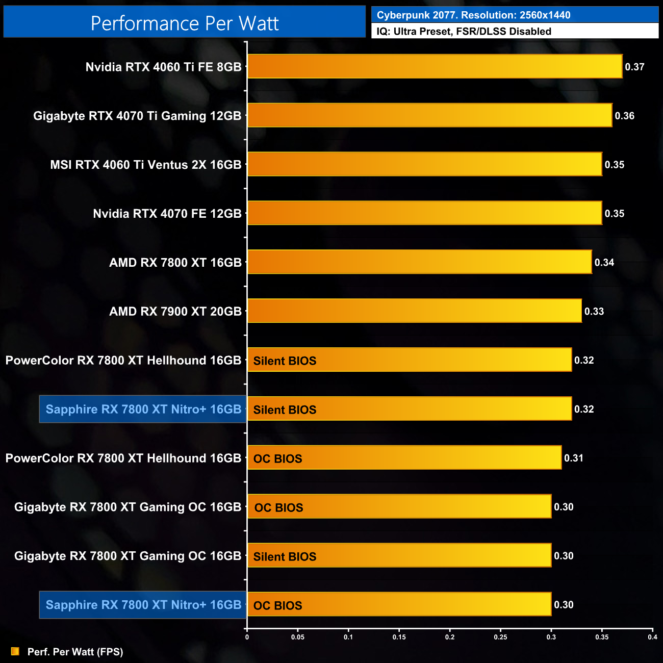 That increased power draw, coupled with small 2-3% performance gains, does mean efficiency is reduced for the Nitro+ – performance per Watt is 12% worse than the reference RX 7800 XT.