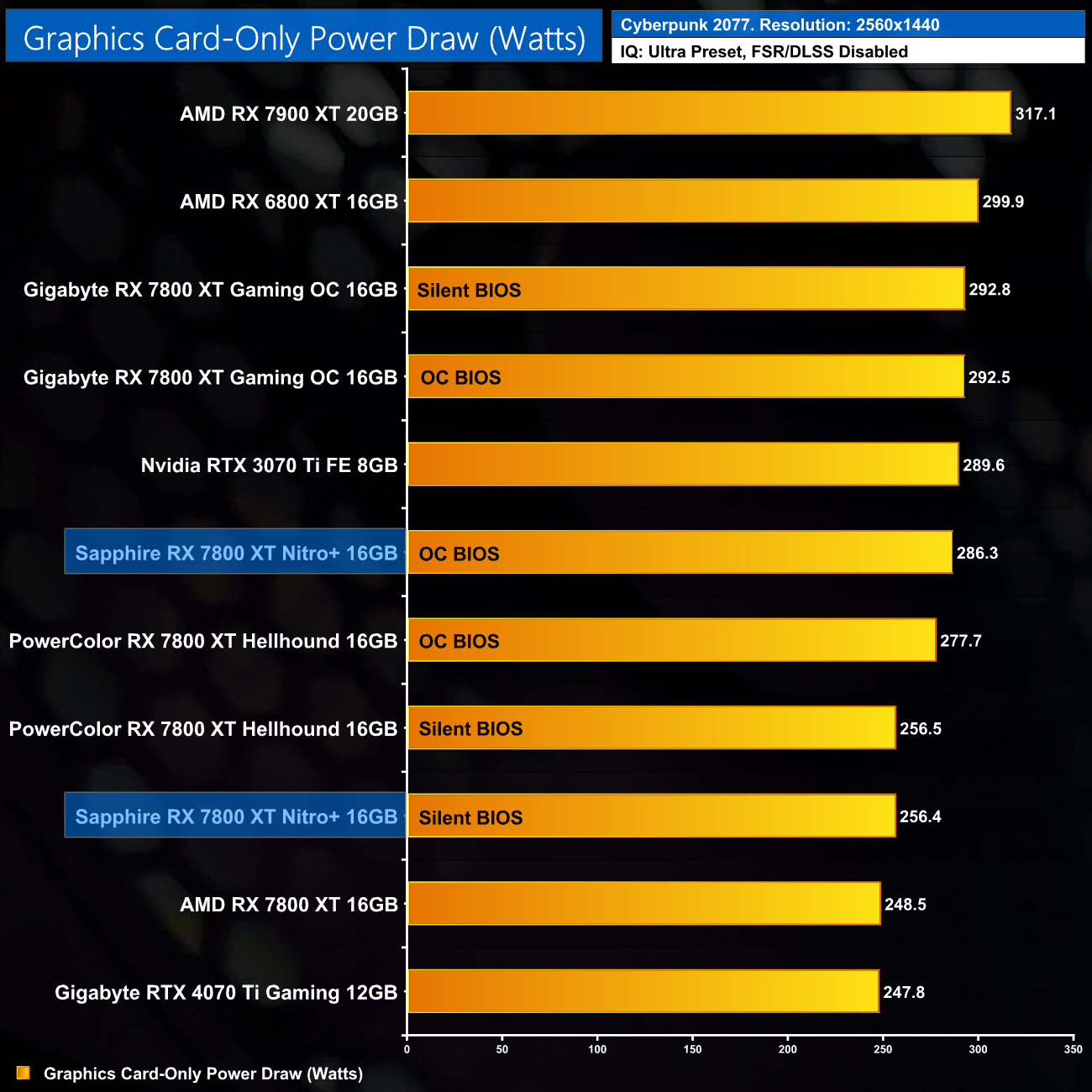 We use Nvidia PCAT to measure power draw of the graphics card only, with readings from both the PCIe slot and the PCIe power cables combined into a single figure. We use Cyberpunk 2077 (4K) for this testing.