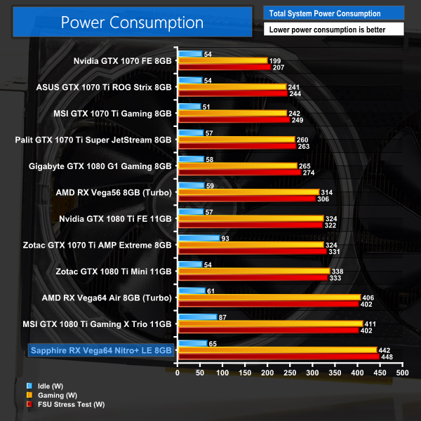 As you probably guessed, adding an extra 8-pin PCIe power connector doesn't exactly help with power consumption, and the Nitro+ draws about 40 Watts more than AMD's reference Vega 64.