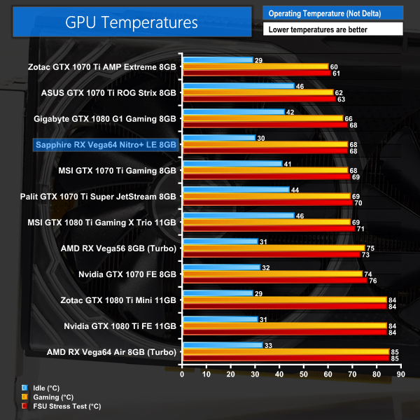 Considering AMD's reference Vega 64 card has a temperature target of 85C, it is quite impressive to see Sapphire's Nitro+ card peak at 68C under load – be it gaming or looping Fire Strike Ultra. That hefty heatsink and triple-fan configuration obviously reaps dividends.