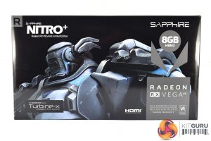 The Sapphire RX Vega 64 Nitro+ Limited Edition card ships in a black box, with a large robotic figure placed on the front.
