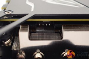 Moving over to the end of the card, sandwiched between the heatsink fin array and backplate we find a solitary 4-pin fan header. Like various ASUS Strix models we have seen over the last year, this allows you to control one of your case fans via the GPU temperature, as opposed to CPU temperature as per a motherboard fan header.