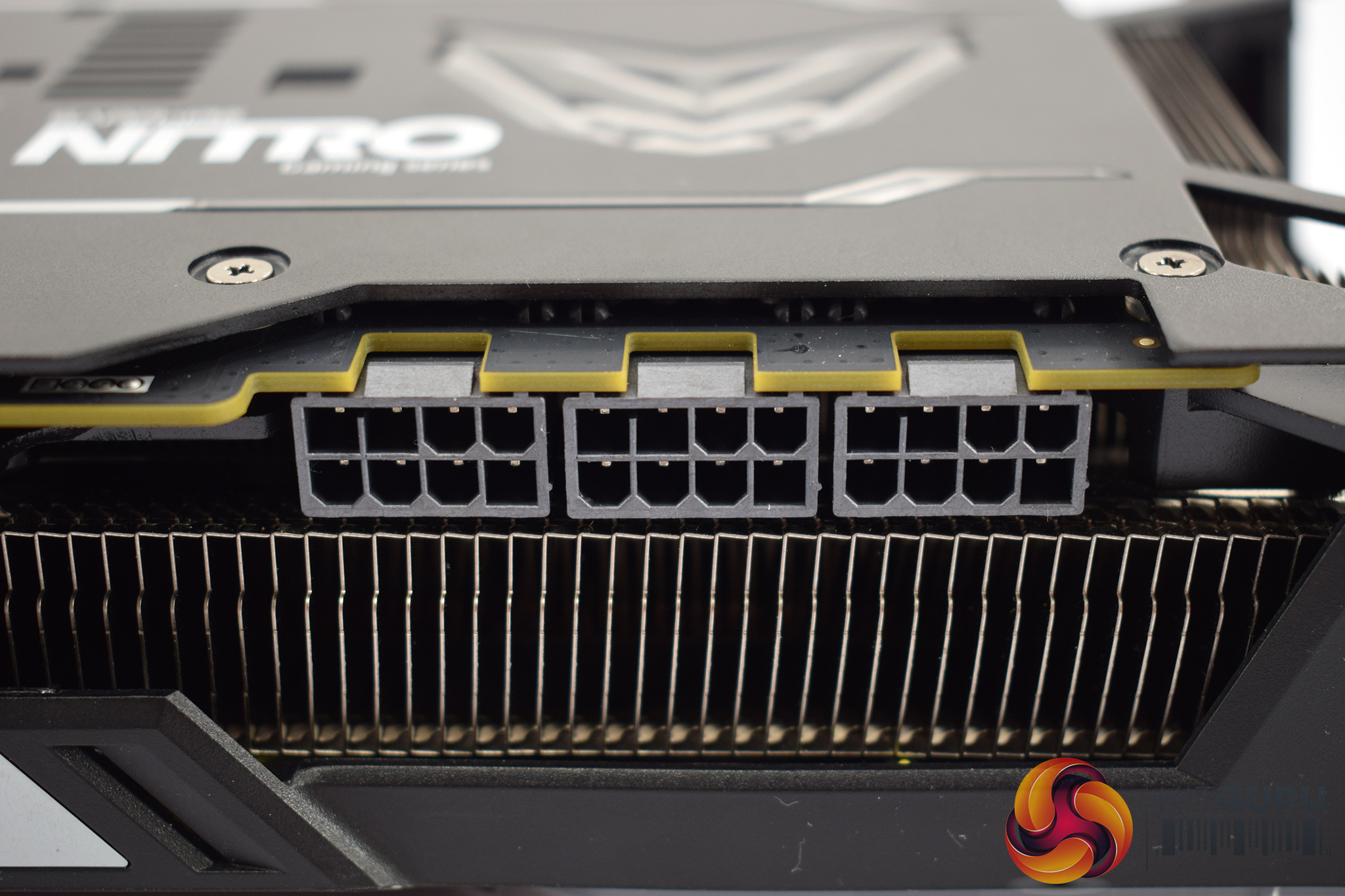 On the side of the Nitro+ LE, we find the required PCIe power connectors: three 8-pin plugs, no less. This is quite something, and I can't remember the last time I saw a mainstream GPU with three 8-pin PCIe power connectors required. Later on in the review we do assess power consumption, so I won't spoil that for you here.