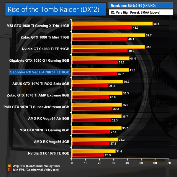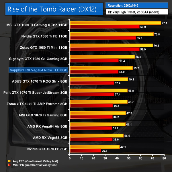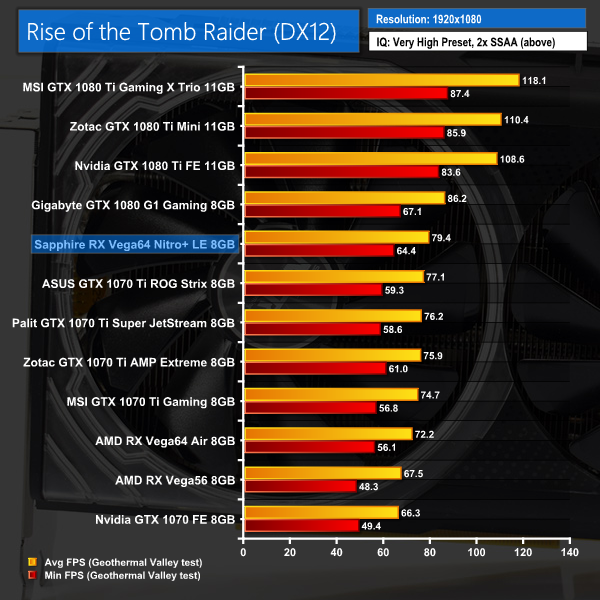 In ROTTR the Nitro+ Vega 64 really closes the gap on Nvidia's GTX 1080, coming within 0.4 FPS of it at 4K. The gap is wider at 1080p, as expected, but Sapphire's card is definitely competitive across all three resolutions.