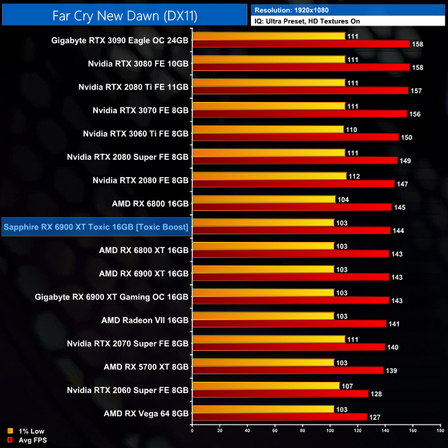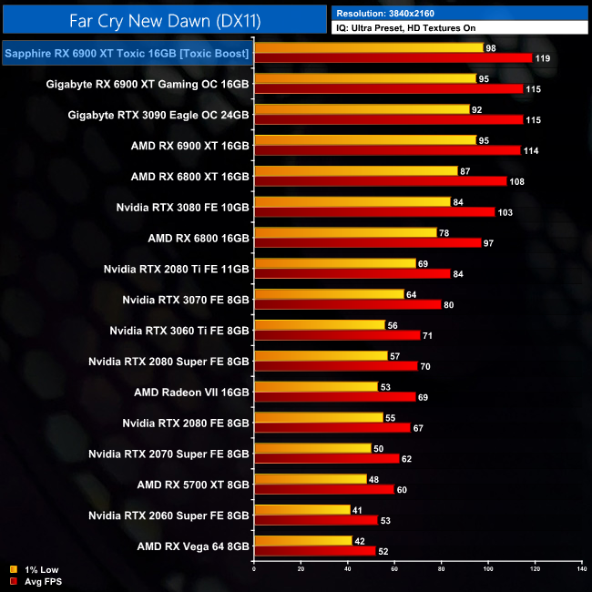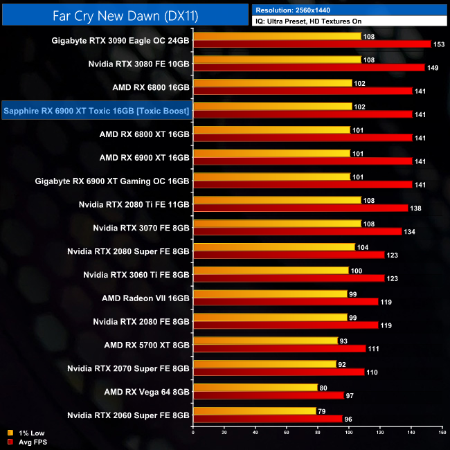 Far Cry New Dawn is heavily CPU-limited, even at 1440p, so the data isn't particularly useful. Even at 4K, the Toxic is just 4% faster than the reference 6900 XT and 3% faster than RTX 3090.