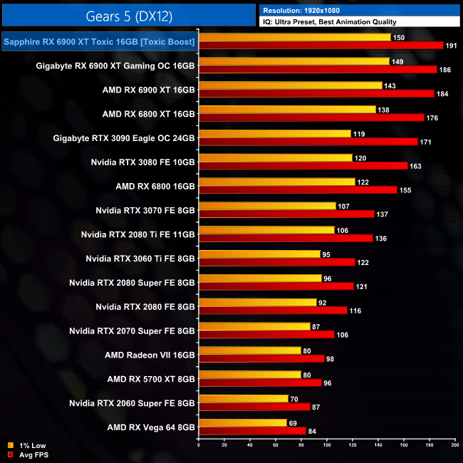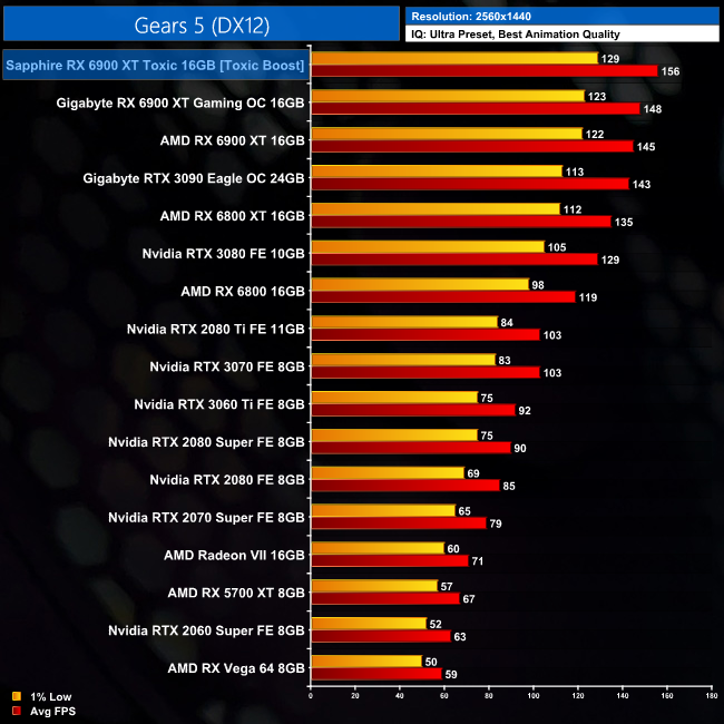 Gears 5 is another AMD title, but at 4K we can see the reference 6900 XT is still 3% slower than the RTX 3090. Thanks to the Toxic's increased clock speed, it comes in 6% faster than the 3090.