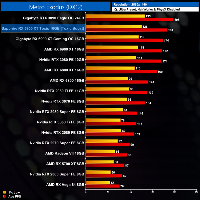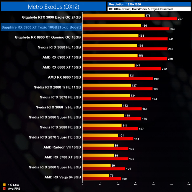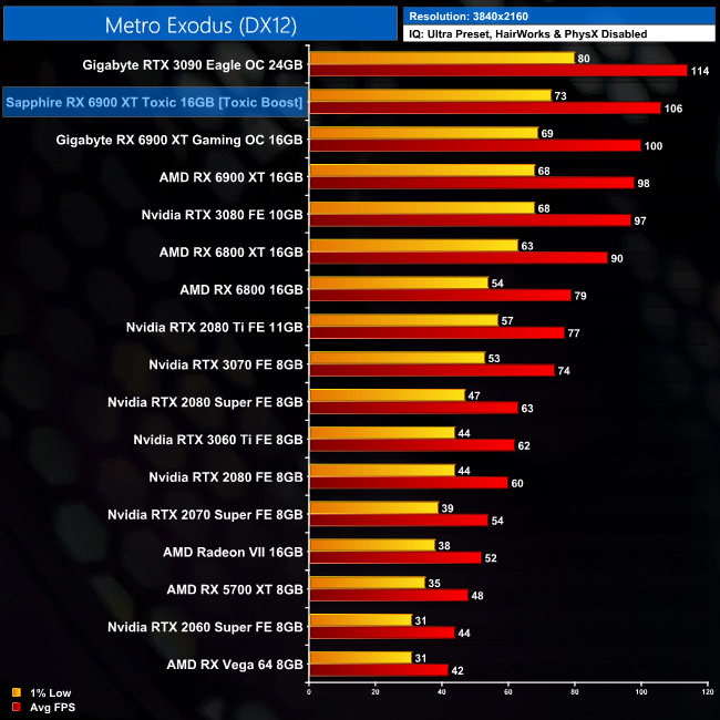 As for Metro Exodus, the Toxic gets an 8% boost compared to the reference 6900 XT here. It's still slower than the RTX 3090 at 4K, but by a significantly reduced margin of 7%.