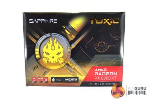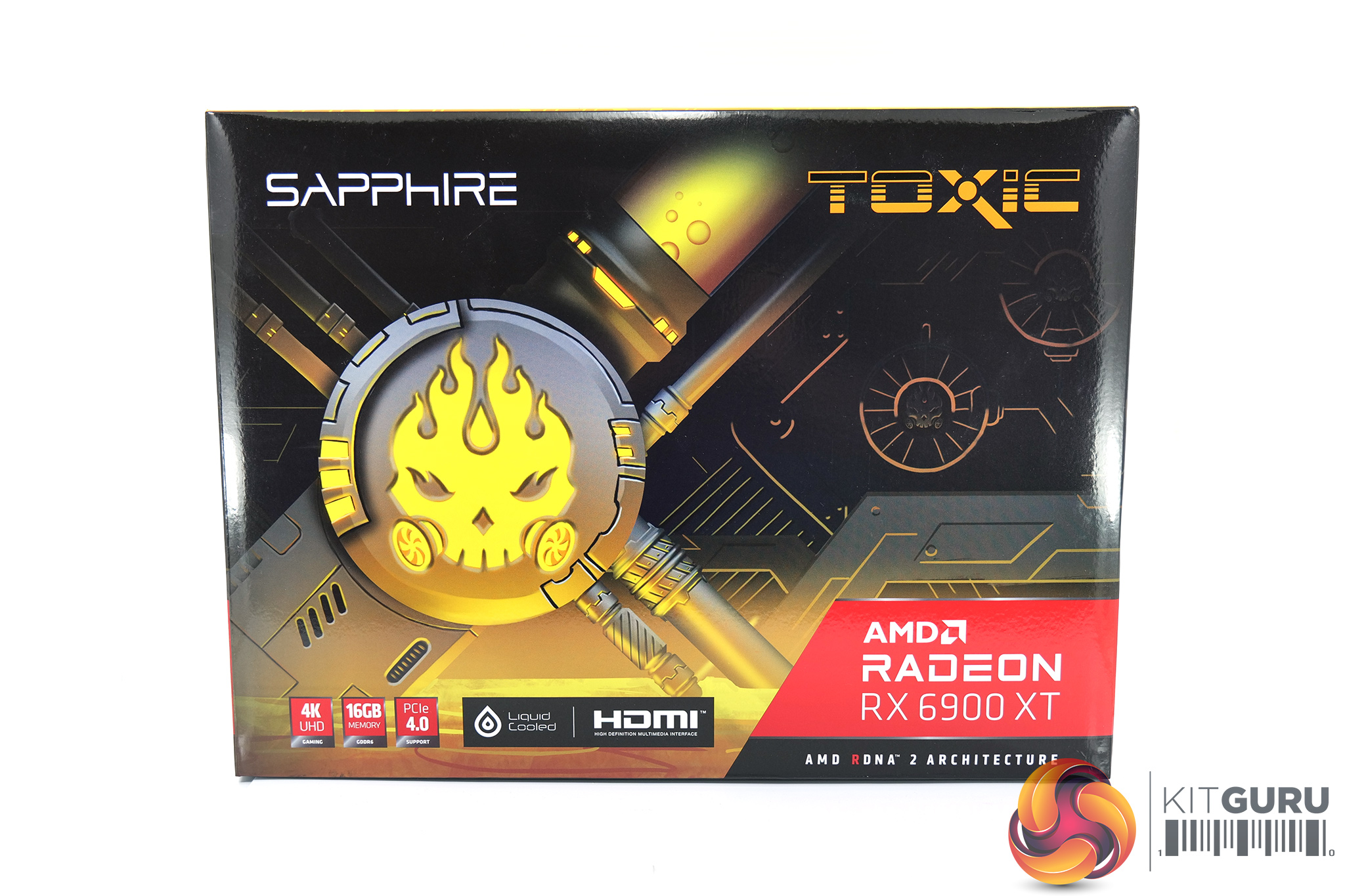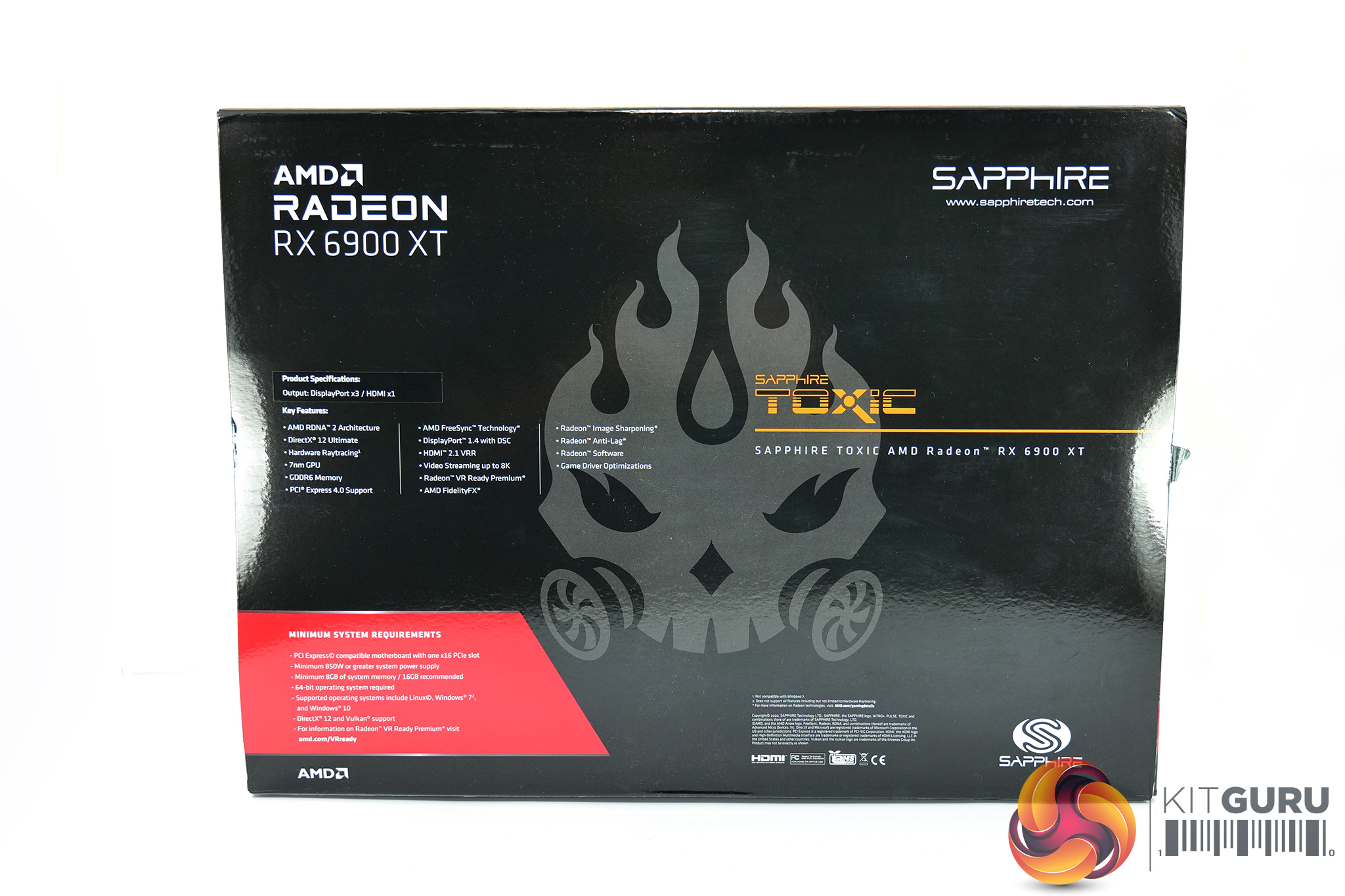 The Sapphire Toxic RX 6900 XT ships in a large black box, with prominent Toxic branding visible on the front. On the back, there's more branding as well as some key specs of the GPU.