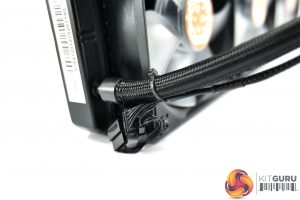 Out of the box, these fans are installed to the underside (or tube-side) of the radiator, with all three fan cables contained within a single sleeved cable running alongside one of the AIO tubes to keep things tidy. This area of installation implies the unit is designed to be installed in the roof of the chassis, with the fans acting as exhausts.