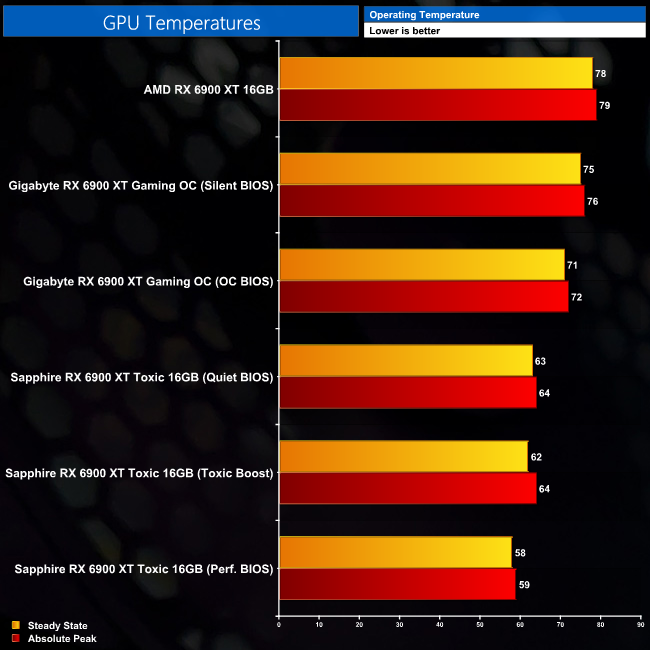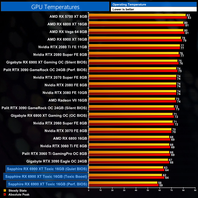 In terms of thermals, it's hardly a surprise to see the Toxic offering sub-70C operating temperatures regardless of the BIOS used. The Performance BIOS gives the lowest temperatures, as a result of its increased fan speed, while the Quiet BIOS is the hottest-running option as it significantly decreases fan speed. Toxic Boost is still hotter than the Performance BIOS as a result of its increased power limit and operating frequencies.