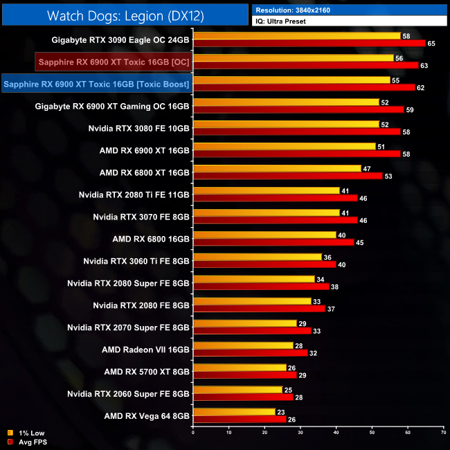This manual overclock barely delivered any extra performance compared to Toxic Boost. In fact, with just a 2FPS difference in F1 2020, and then an improvement of just a single frame for Gears 5 and Watch Dogs: Legion, I'd say there is no actual difference with this overclock applied.