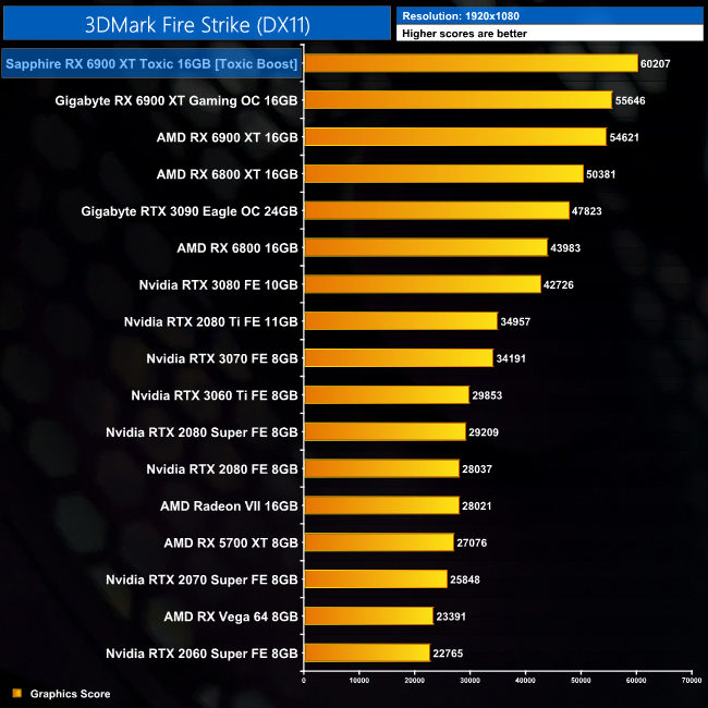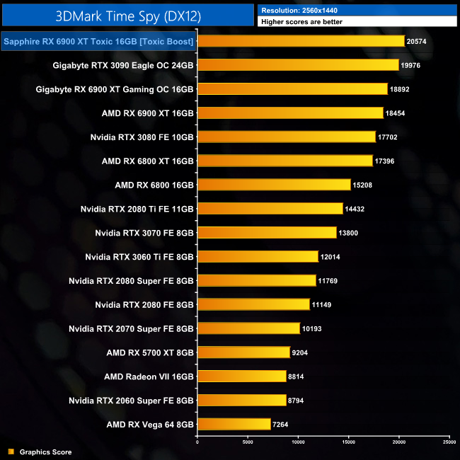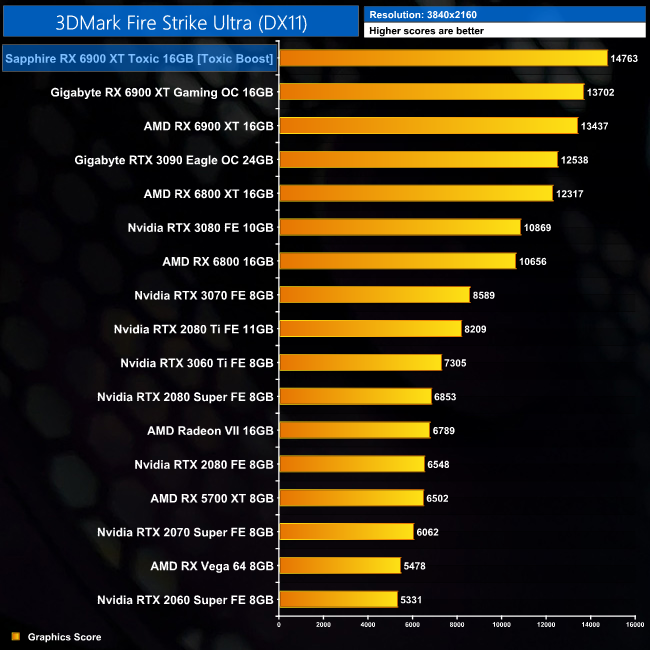 Kicking off with 3DMark, we can immediately see sizable performance gains for the Toxic when compared to AMD's reference card. It's 10% faster in both Fire Strike and Fire Strike Ultra, and 11% faster in Time Spy. It's also faster than the RTX 3090 in all three benchmarks.