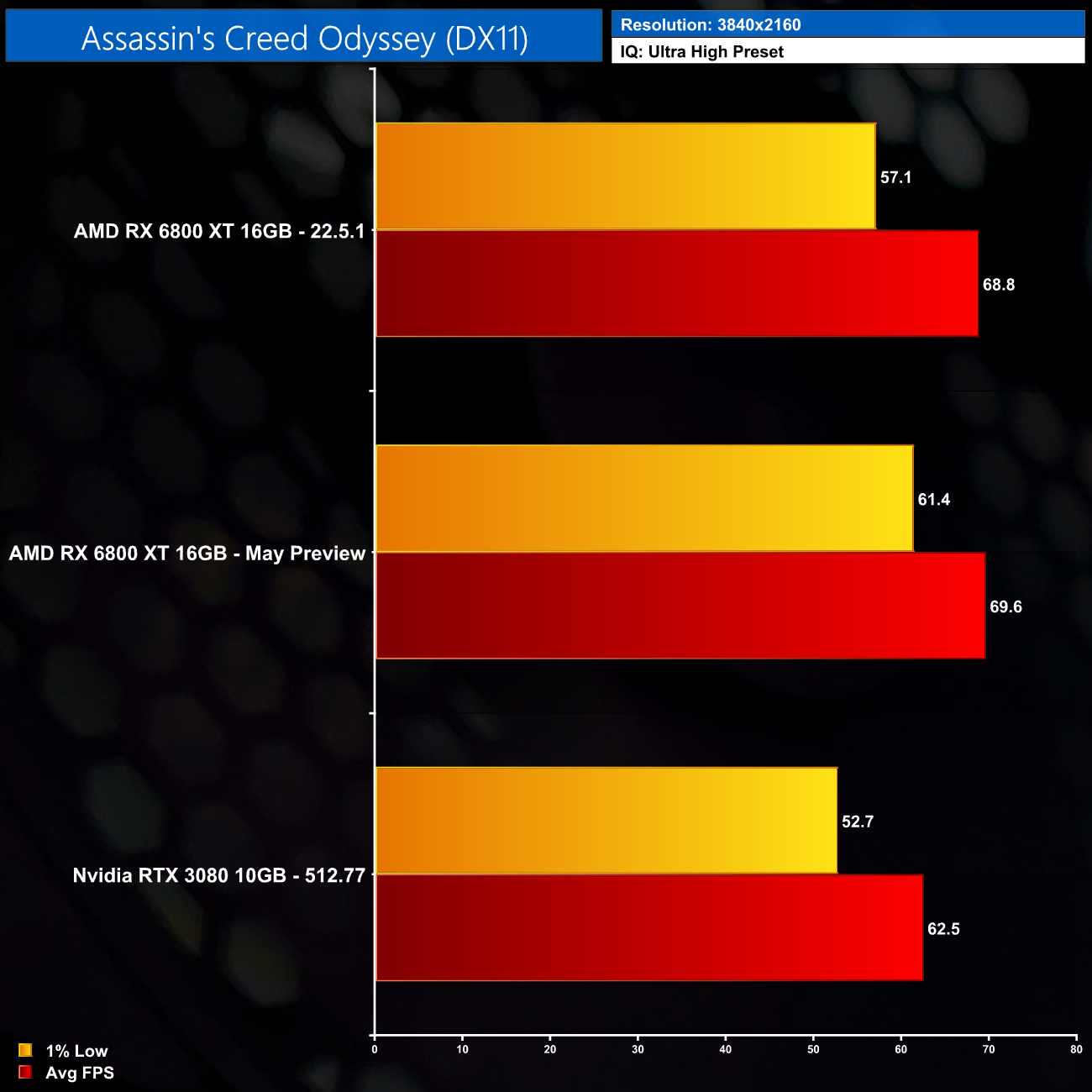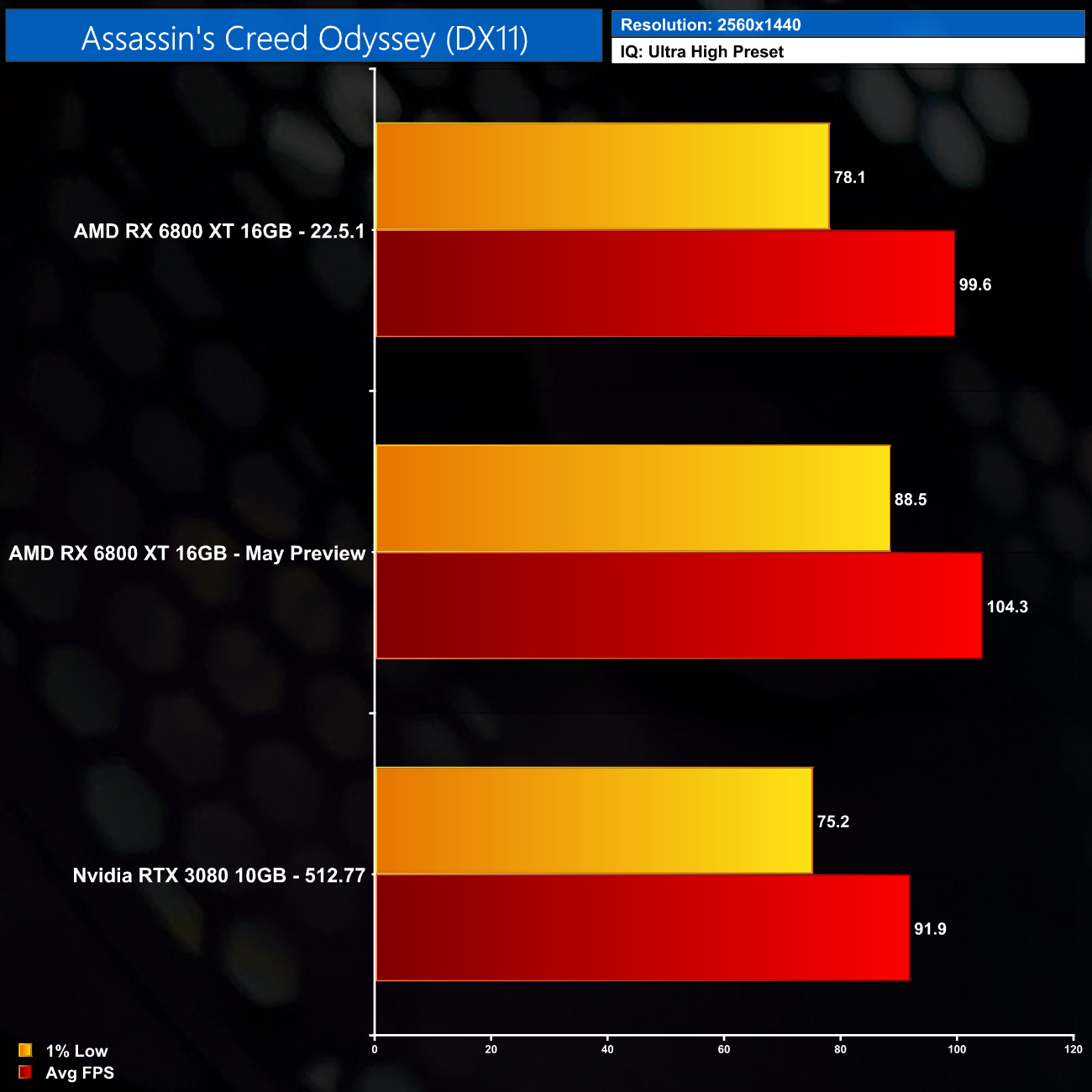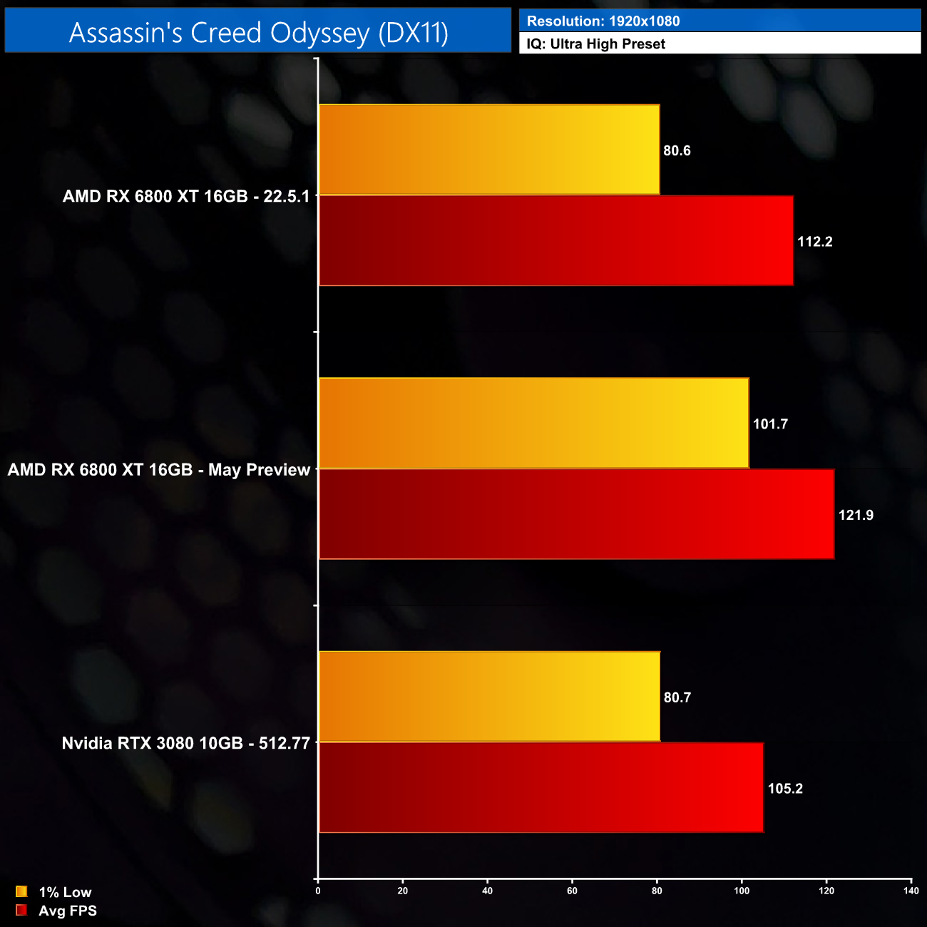 Kicking off with Assassin’s Creed Odyssey, straight away we can see a tidy improvement for AMD when using the Preview driver – yes, the average frame rate goes up by almost 10FPS, but the 1% lows are much more impressive – jumping up from 80FPS to over 100FPS, which is a 26% improvement.