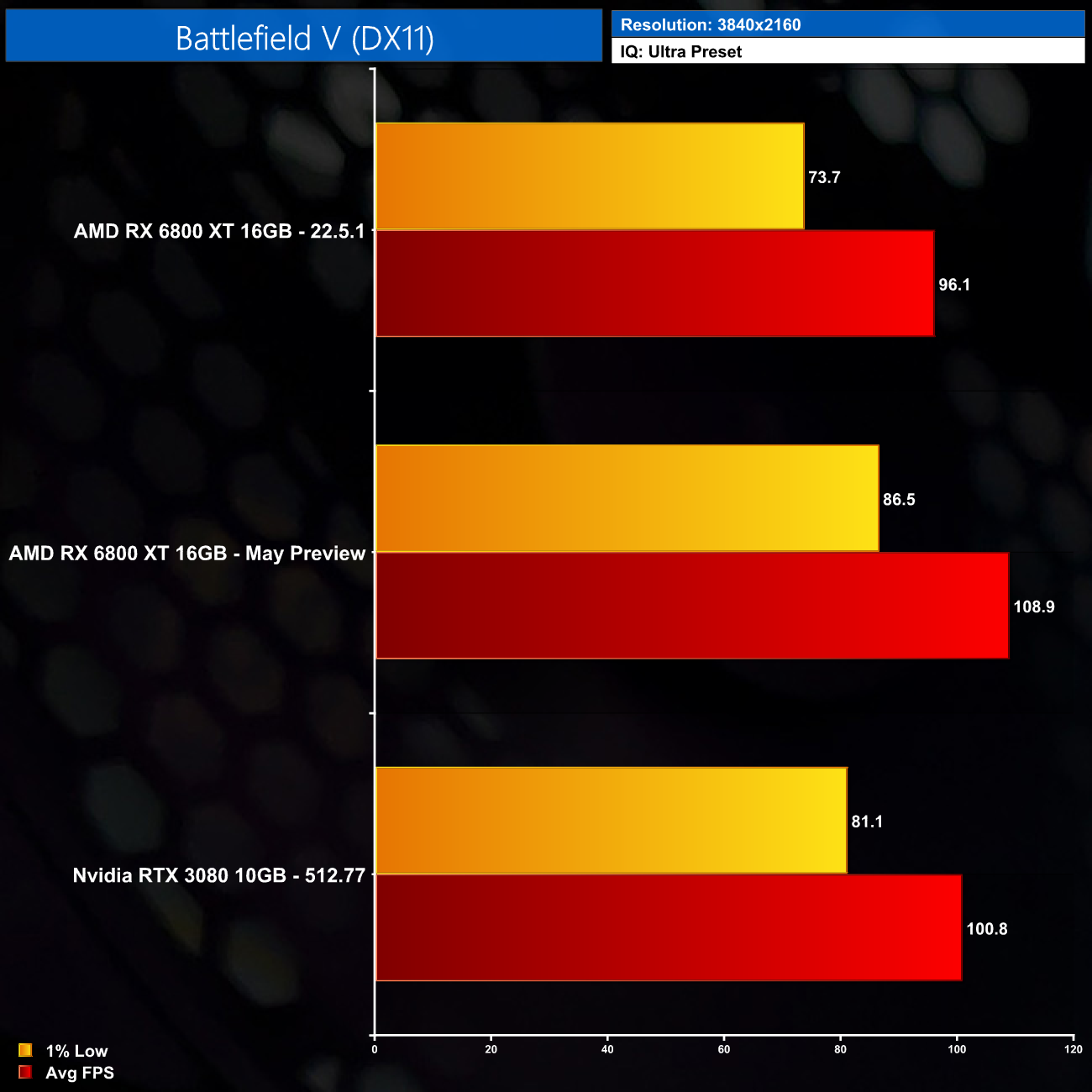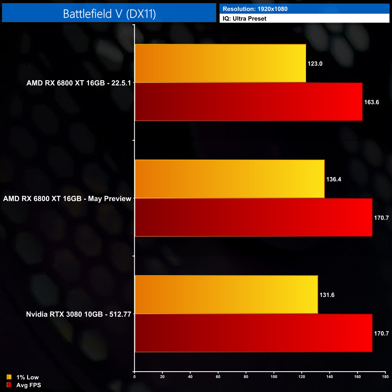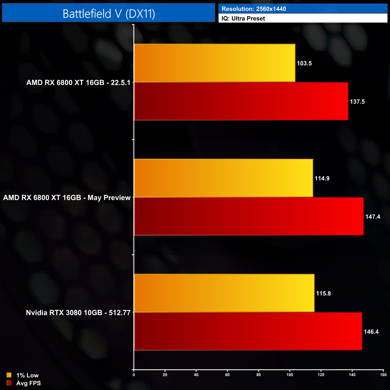 Next up is Battlefield V, and starting at 1440p it is another clear case of improvements with the Preview driver. Both the average FPS and 1% lows improve by 7% and 10% respectively. That brings the 6800 XT level with the RTX 3080 in this title, when previously the AMD GPU was that bit slower.