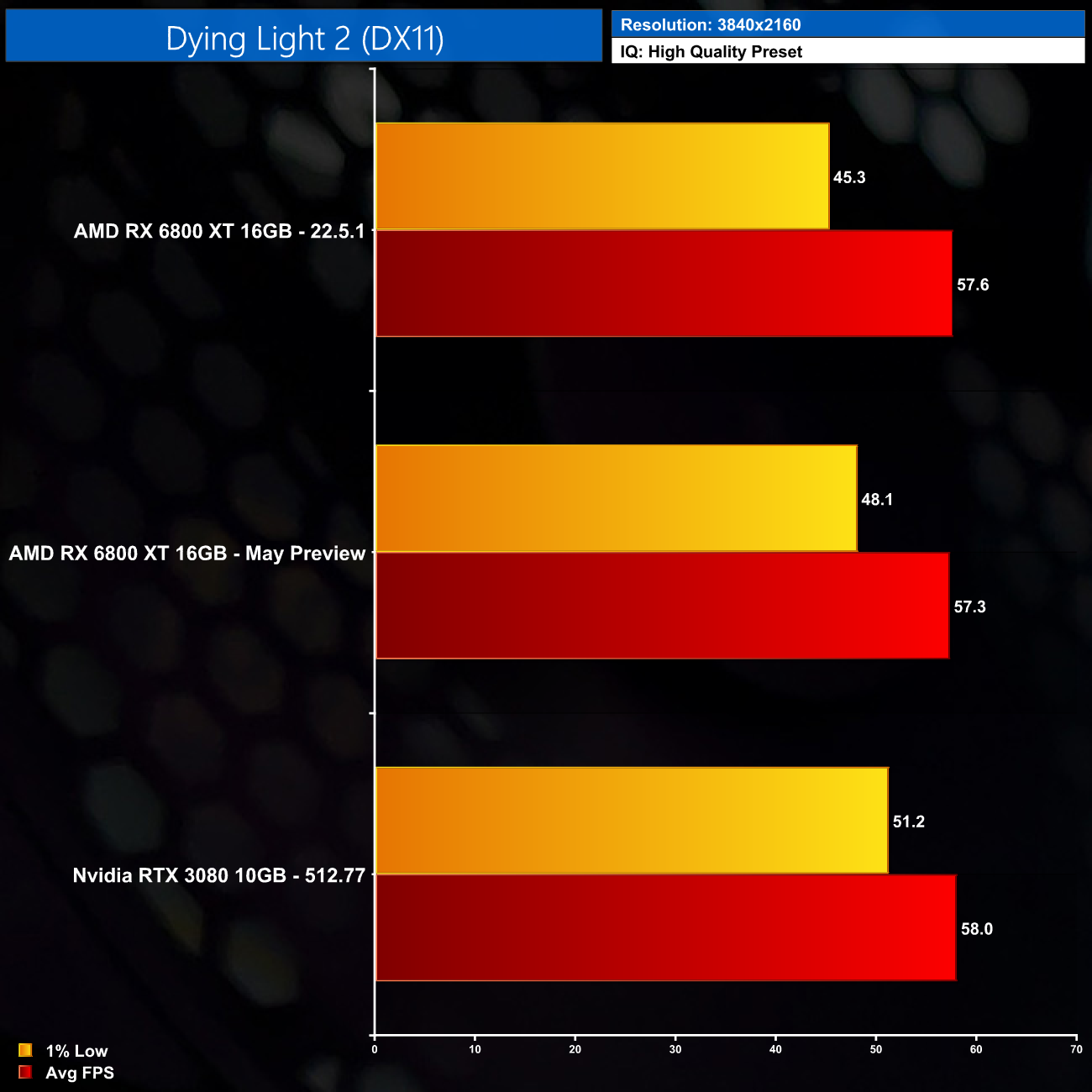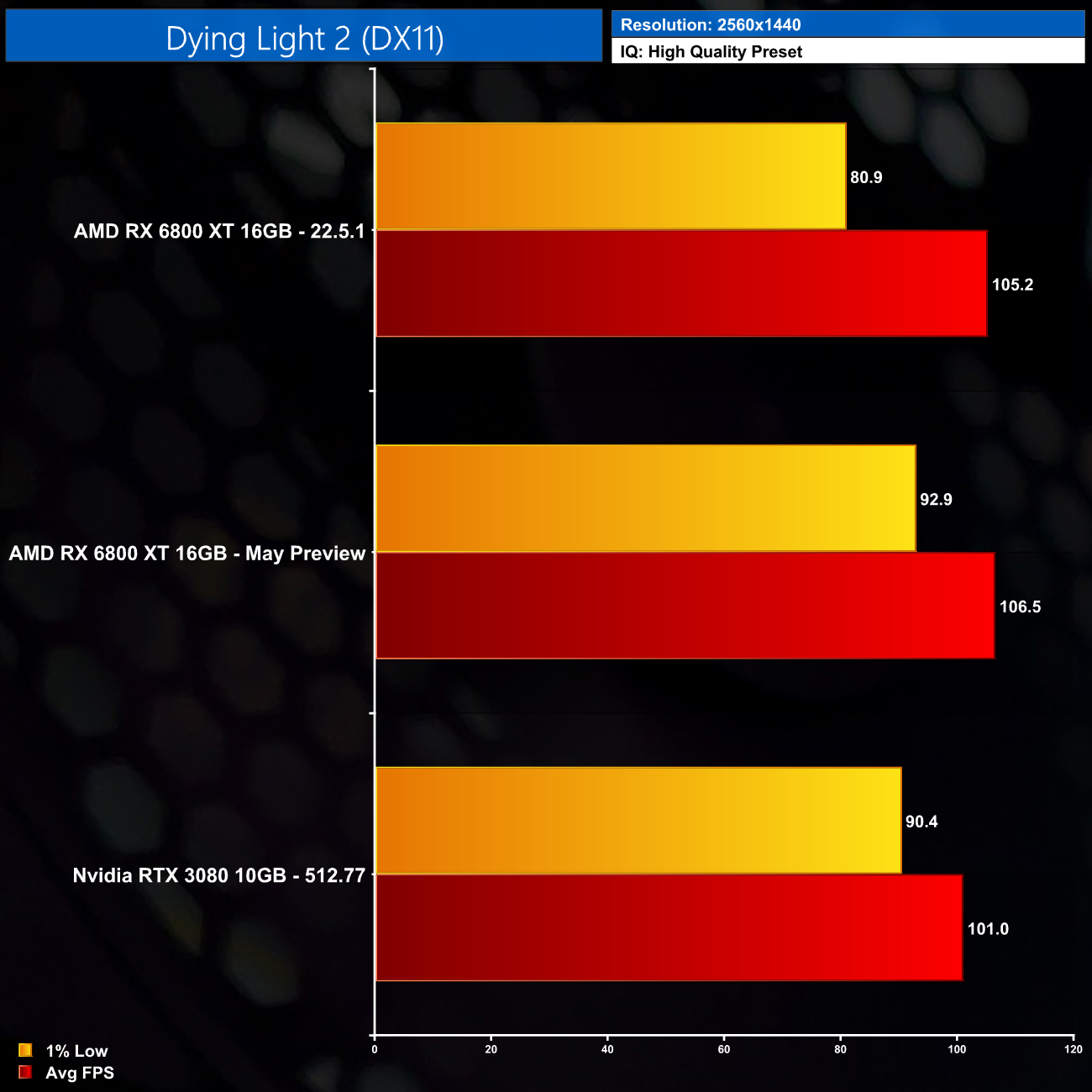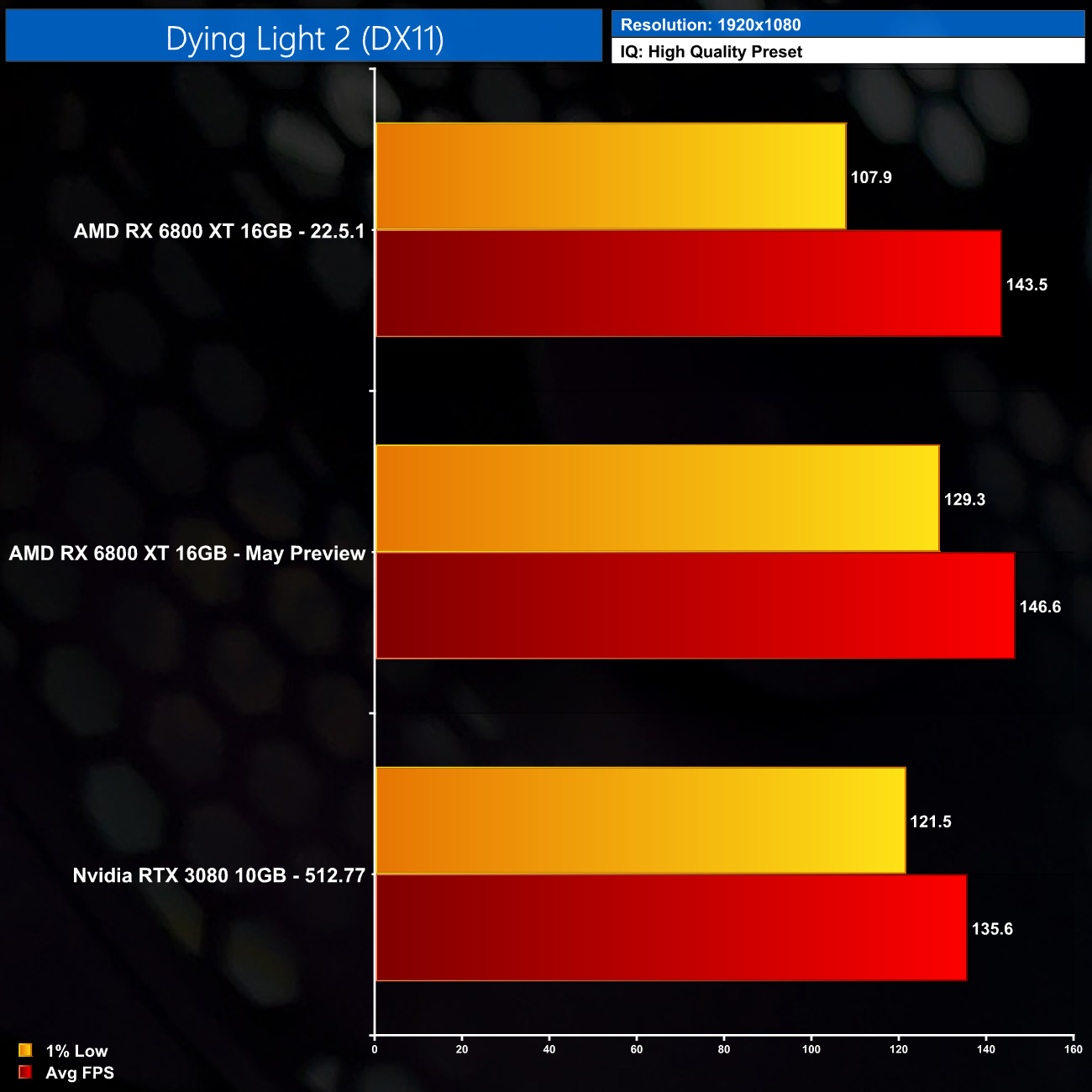 Next up then is Dying Light 2, where at 1440p we see next to no difference in the average frame rate between either the Preview or 22.5.1 drivers. The key is the 1% lows though, as with the Preview driver, the 6800 XT runs that bit smoother, with a 15% increase to the 1% lows. That’s especially important considering the RTX 3080 initially had the upper hand for 1% low performance in this title, but that lead evaporates when testing with the AMD Preview driver.