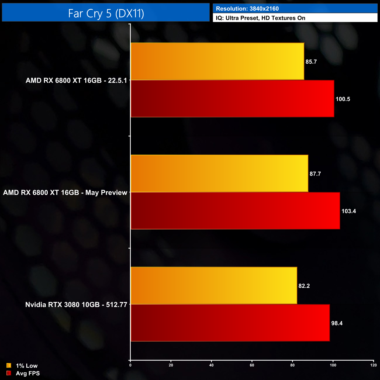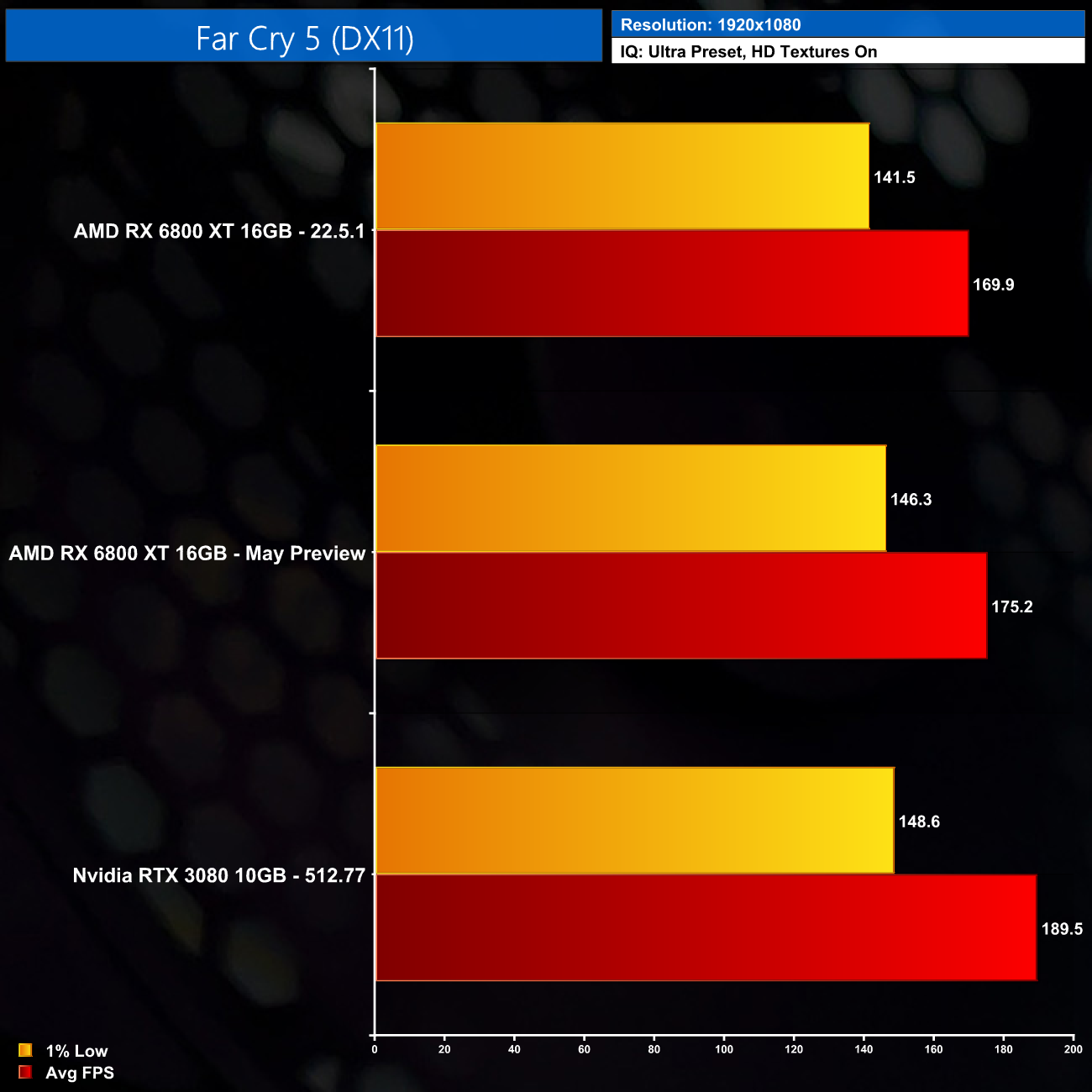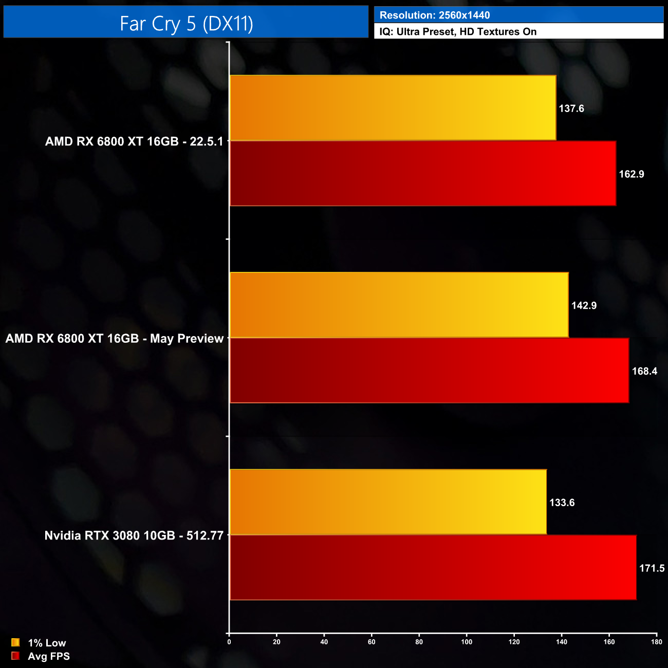 As for Far Cry 5, we saw very consistent performance across each resolution tested – the Preview driver nets consistent gains of between 3-4% compared to 22.5.1, and that includes the 1% low performance . A 3% difference is just outside margin for error, so it is an improvement, it’s just nothing to really get excited about.