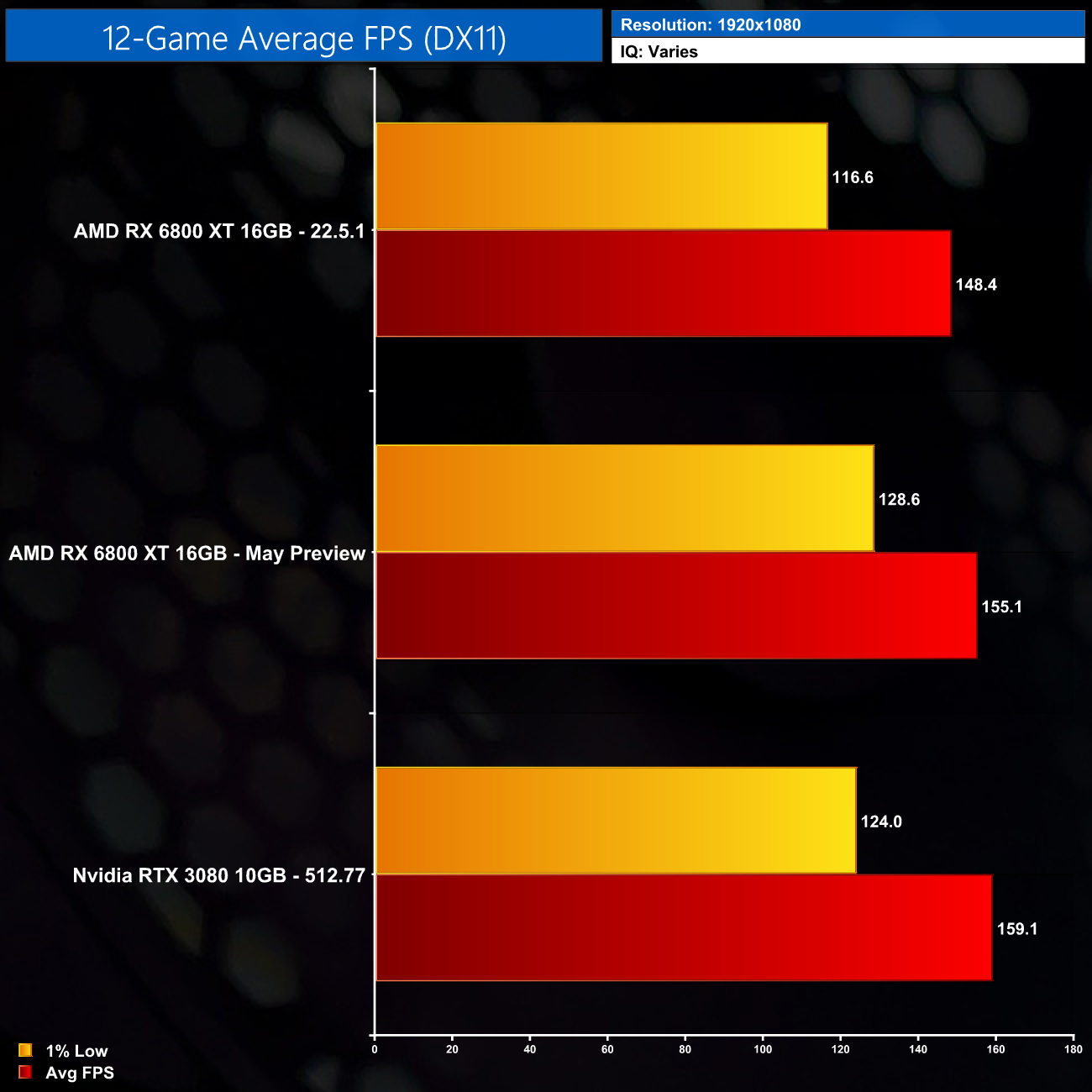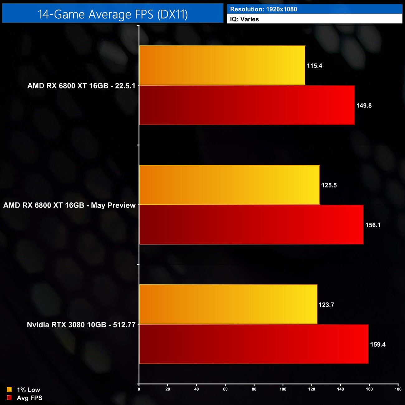 Taking a look at the big picture overview, here we present the 14-game average results. At 1080p, we can see a clear improvement for DX11 performance using the May Preview driver. Yes, the average frame rate increased by 4%, but the 1% lows – which are arguably more important – saw a 9% boost up to 125.5FPS, which is actually slightly better than the RTX 3080’s 1% lows, though the average frame rate is still slightly behind.