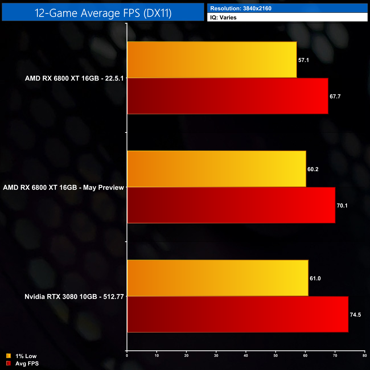 It’s more of the same at 4K too, with a 4% improvement to the average frame rate, though a smaller 2% margin for the 1% lows. The 6800 XT can’t quite catch the RTX 3080 at this resolution, but it is closer with the new driver.
