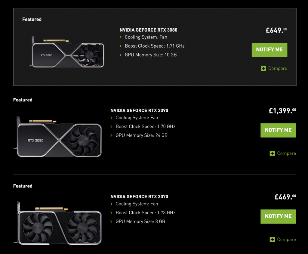 Cutting right to the chase, Nvidia hasn't simply replaced the dollar sign with a British Pound sign, as the $499 RTX 3070 is set to retail for £469 here in the UK. The $699 RTX 3080 is priced at £649, while the king of the hill RTX 3090 – priced at an eye-watering $1499 – will set UK customers back by £1399.