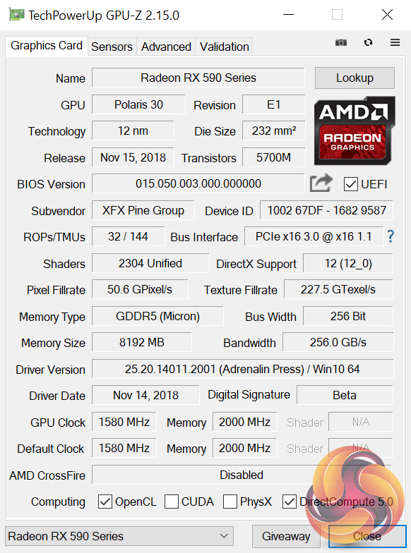 Despite AMD not releasing a reference RX 590 card, reference specs were announced, with boost clocks going up to 1545MHz. This XFX Fatboy improves on that, as it ships with a 1580MHz boost clock. Unlike the Sapphire RX 590 we reviewed for launch day, however, this XFX has left the memory at the stock 2000MHz.